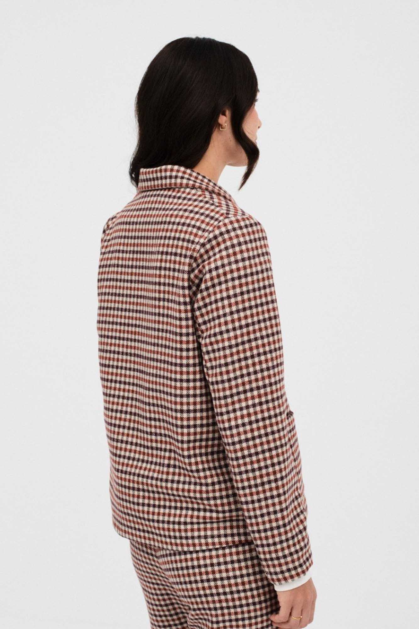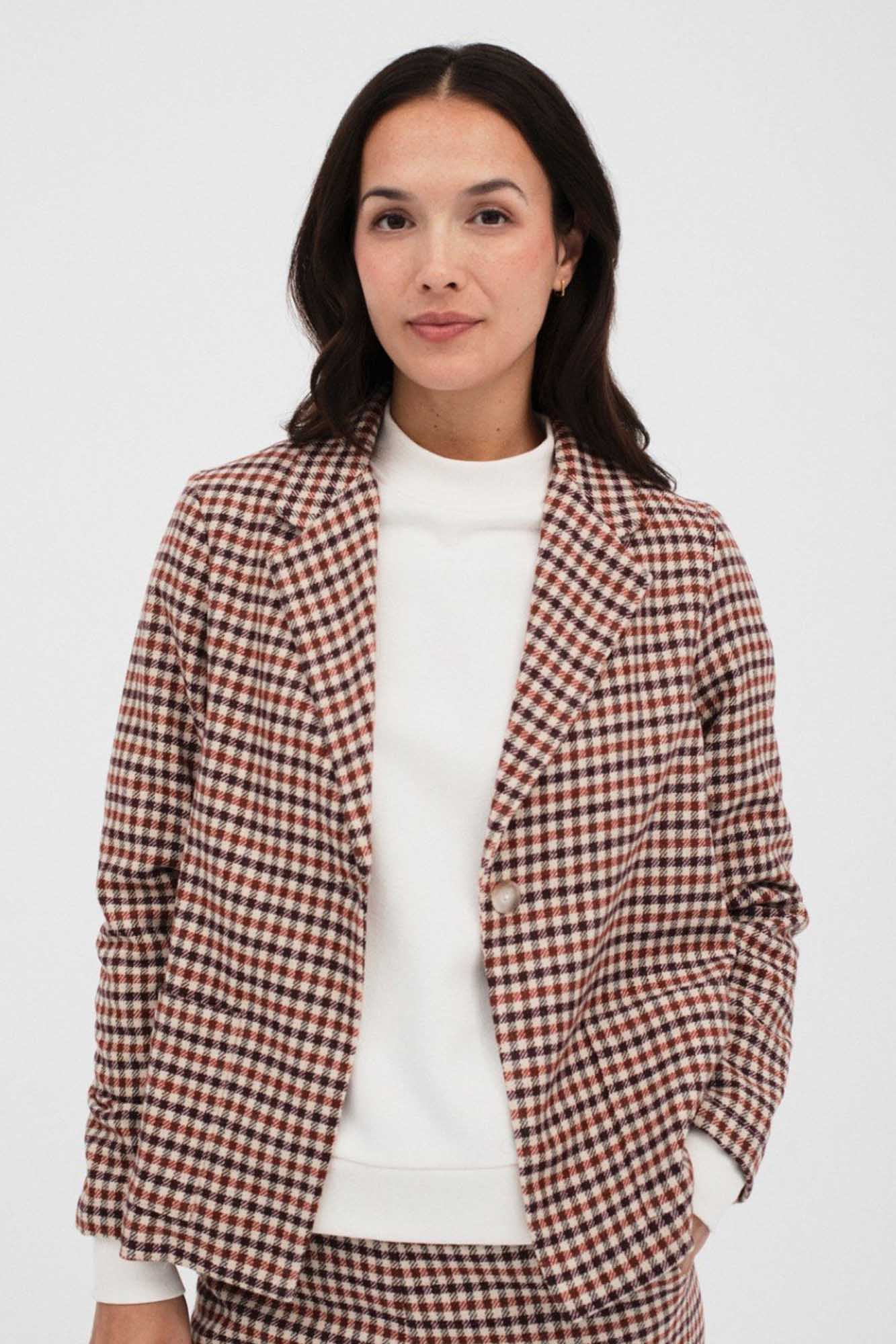 Chaqueta de suave tejeduría de cuadros en tonos cálidos.