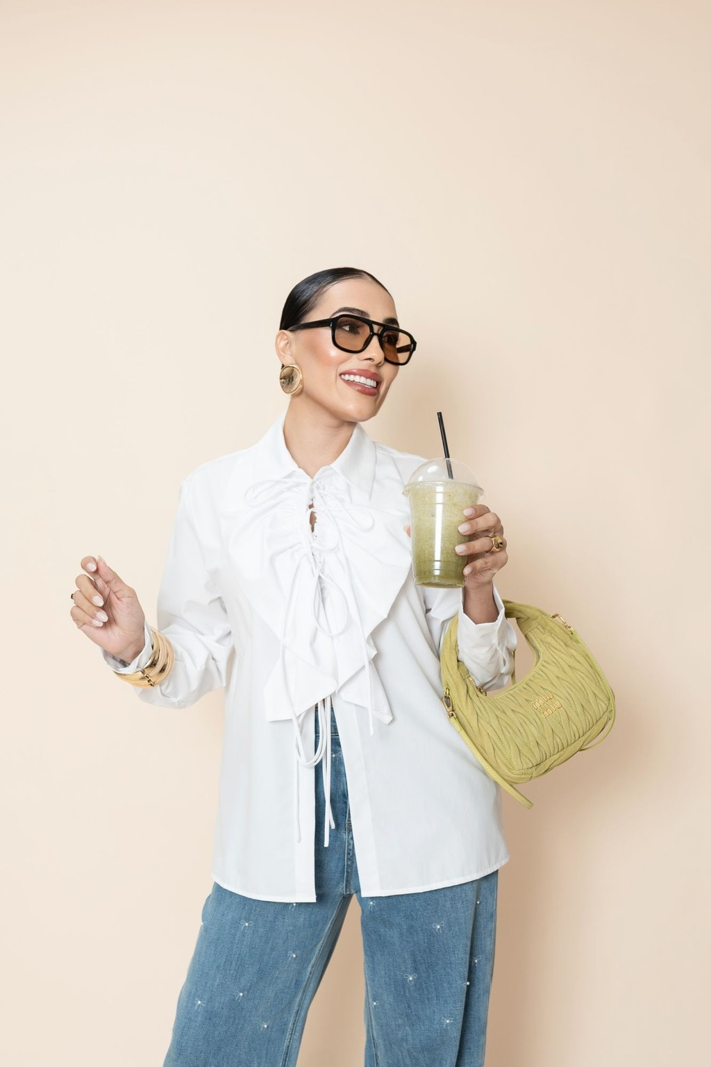 Además, esta blusa blanca con volantes y lazo para mujer ofrece un corte cómodo y favorecedor, con mangas largas y cuello clásico. Por eso, es perfecta para usarla tanto dentro como fuera del pantalón, adaptándose a tu estilo y ocasión. Incluso puedes llevarla con jeans bordados, pantalones de vestir o faldas para lograr looks completamente distintos con una sola pieza.