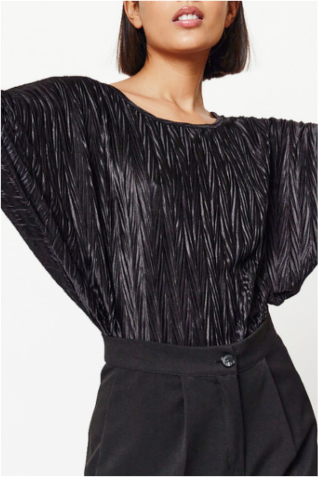 Las mangas murciélago son otro detalle distintivo de esta blusa. Estas mangas amplias y sueltas agregan un toque de elegancia y sofisticación al conjunto, al tiempo que brindan comodidad y movimiento. Los grandes puños de la blusa también contribuyen a su aspecto elegante, añadiendo un toque de glamour y estilo.