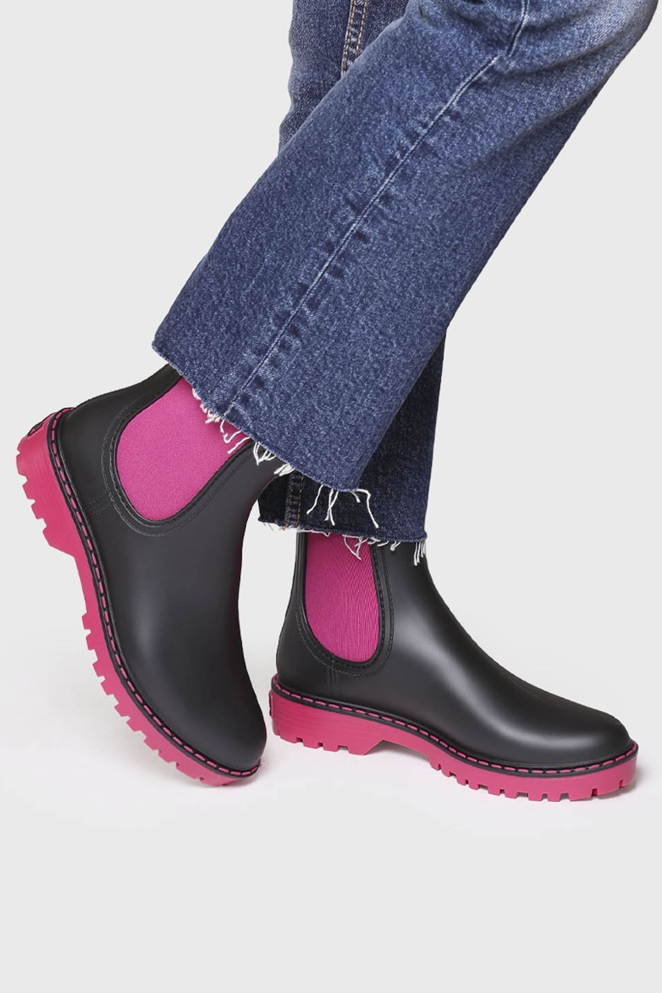 Botas de agua de color negro con elástico en los laterales en color fucsia.
