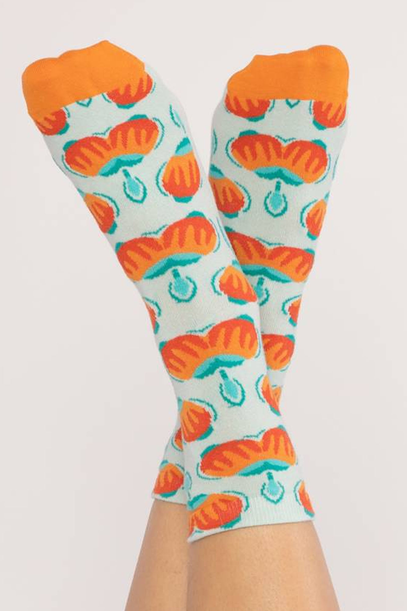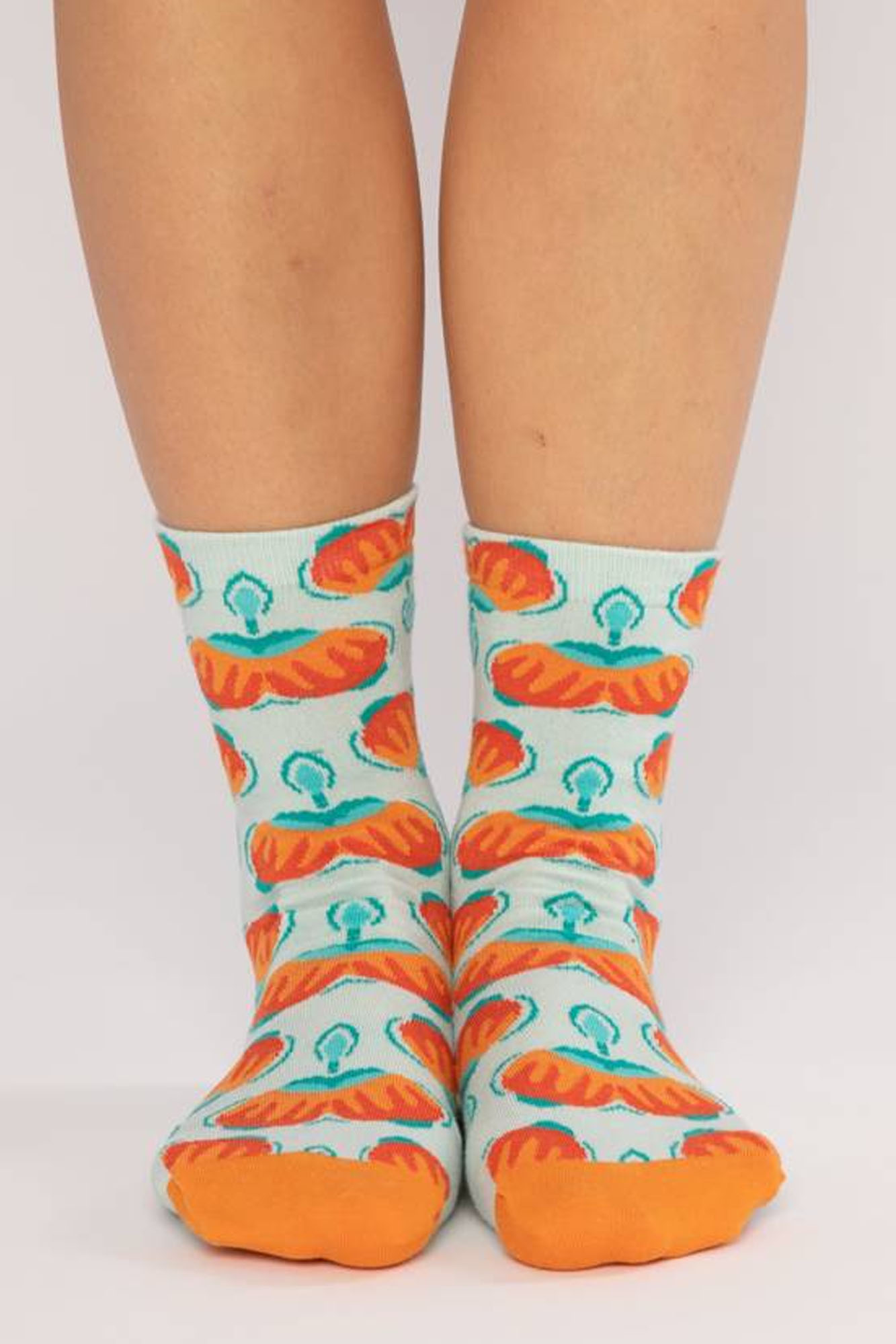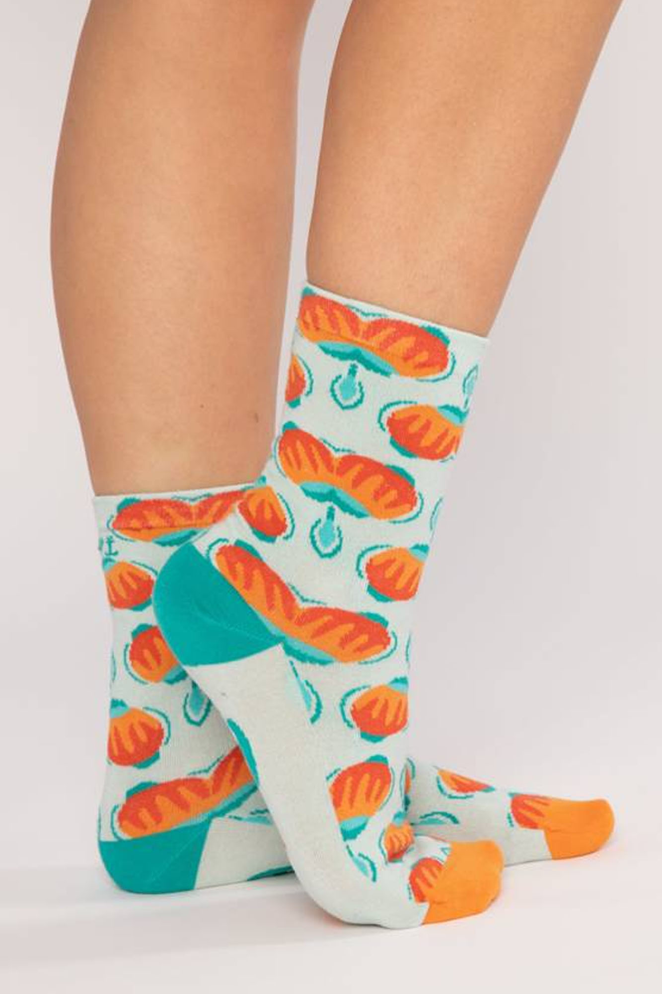 Calcetines de algodón orgánico con estampado en tonos azules y naranjas.