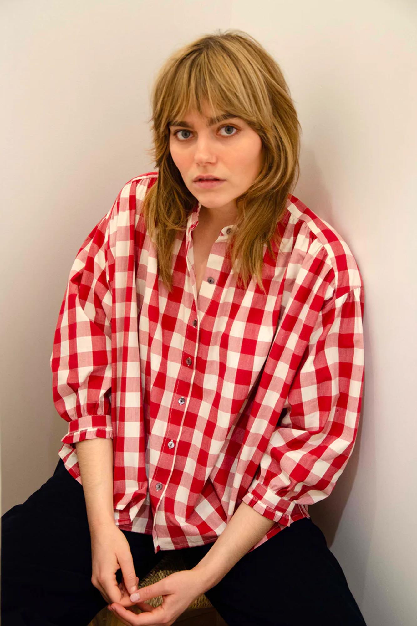 Camisa de algodón de cuadros estilo vichy en blanco y rojo.