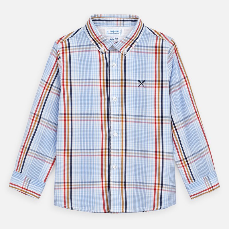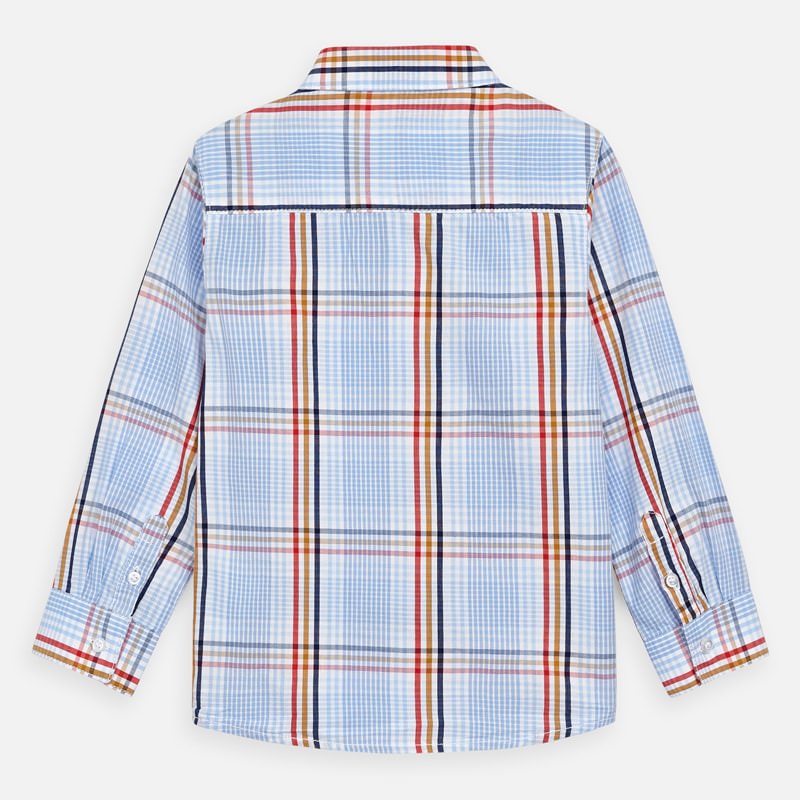 Camisa de manga larga para niño con puños abotonados. Cuello camisero. Cierre con botones en la parte delantera. Cómodo tejido de popelín, duradero y de fácil cuidado. Elementos de adorno: bordado. Motivo de cuadros. Por motivos de seguridad, las tallas pequeñas (2-3 años) pueden sufrir algunas variaciones en los elementos decorativos que se usen en el diseño.