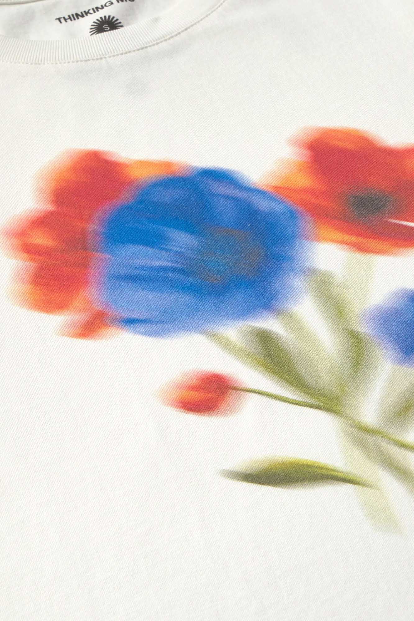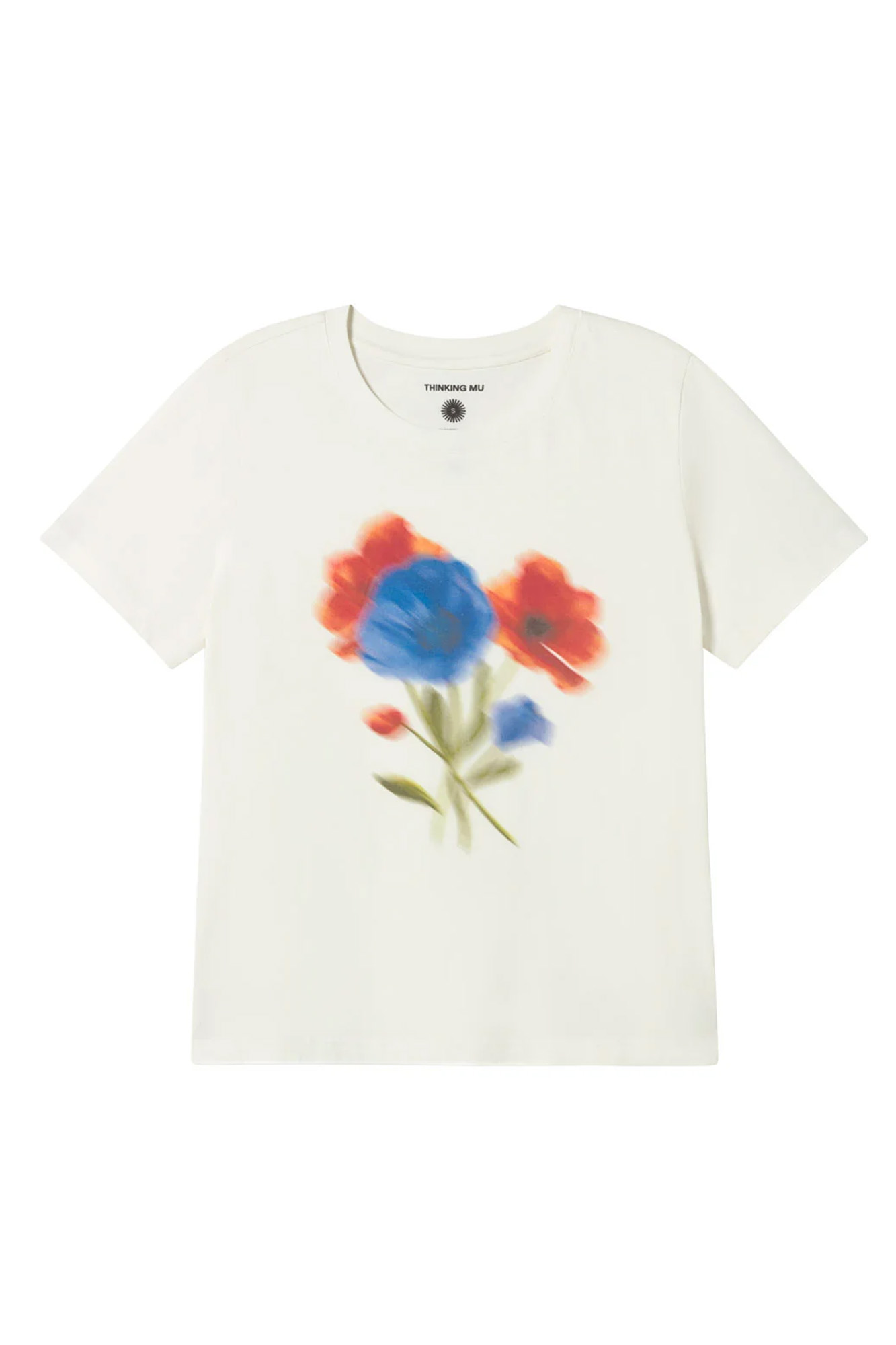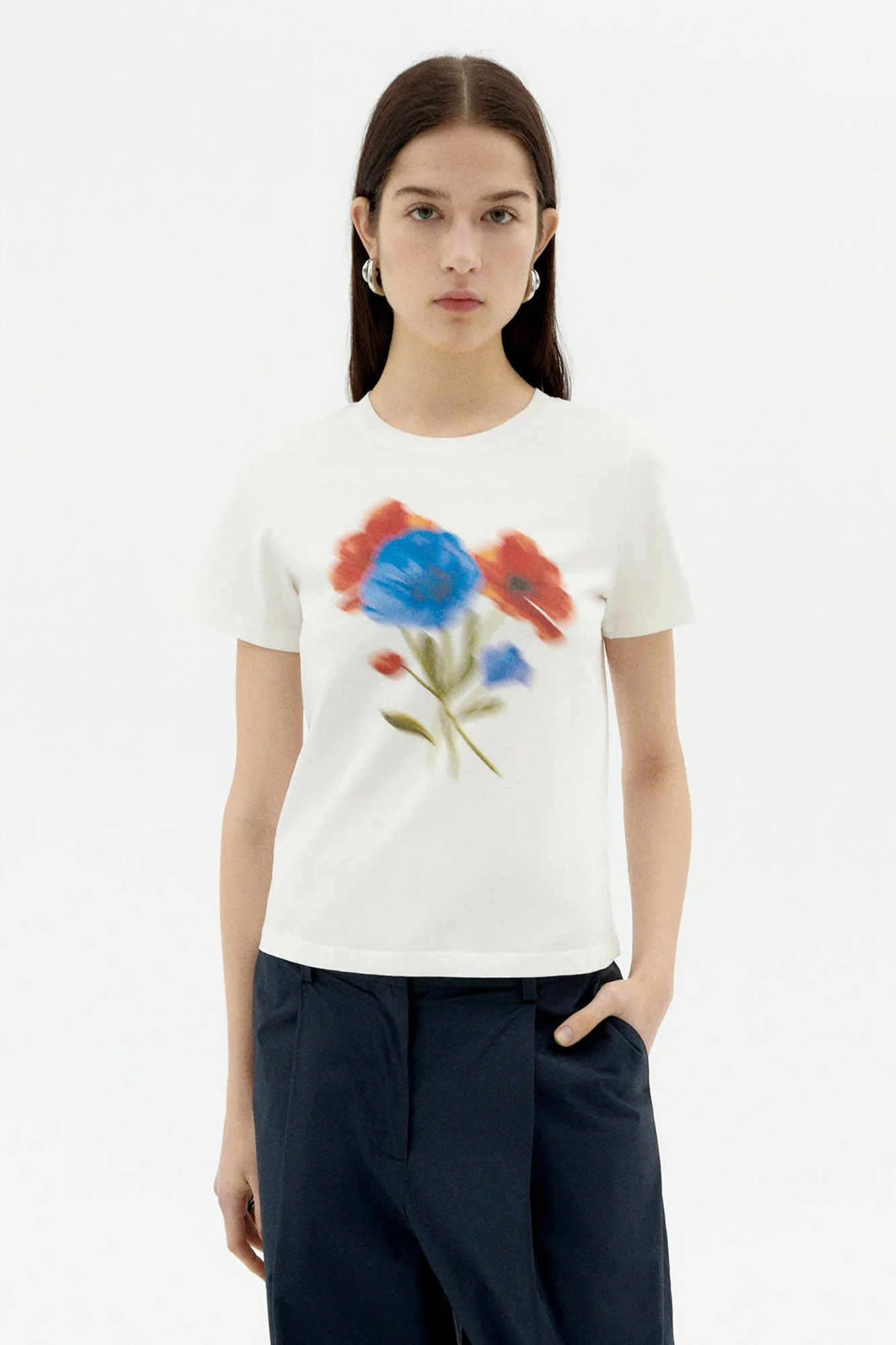 En el delantero de la camiseta se dibuja un ramito de flores desenfocado.