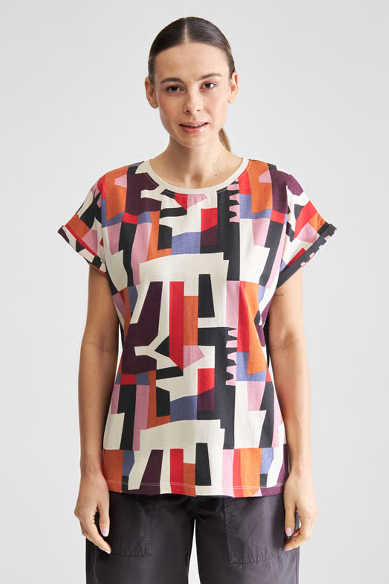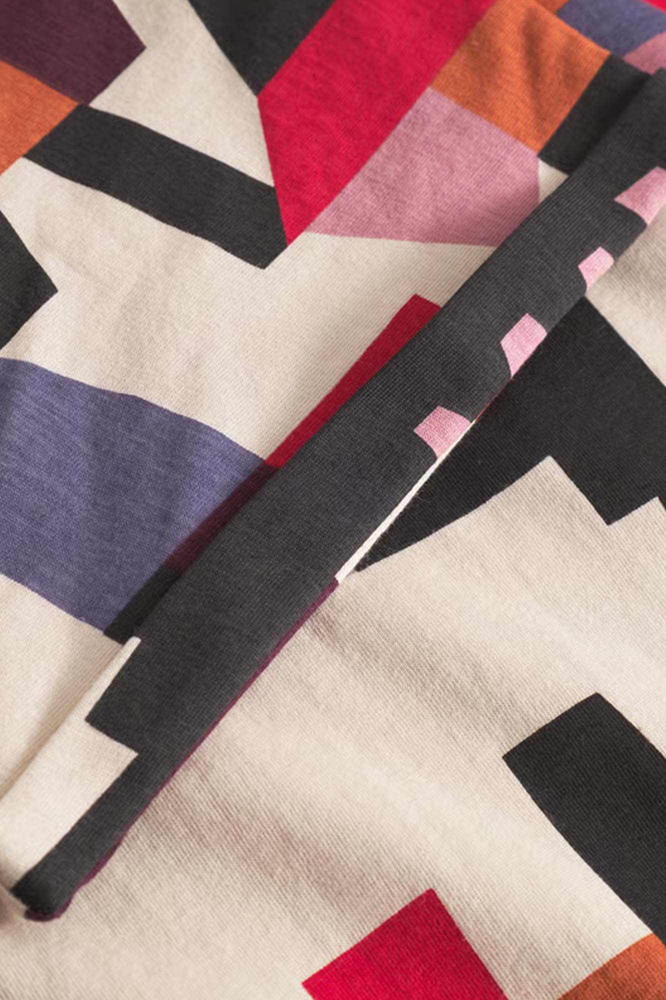 Con un colorido estampado geométrico.