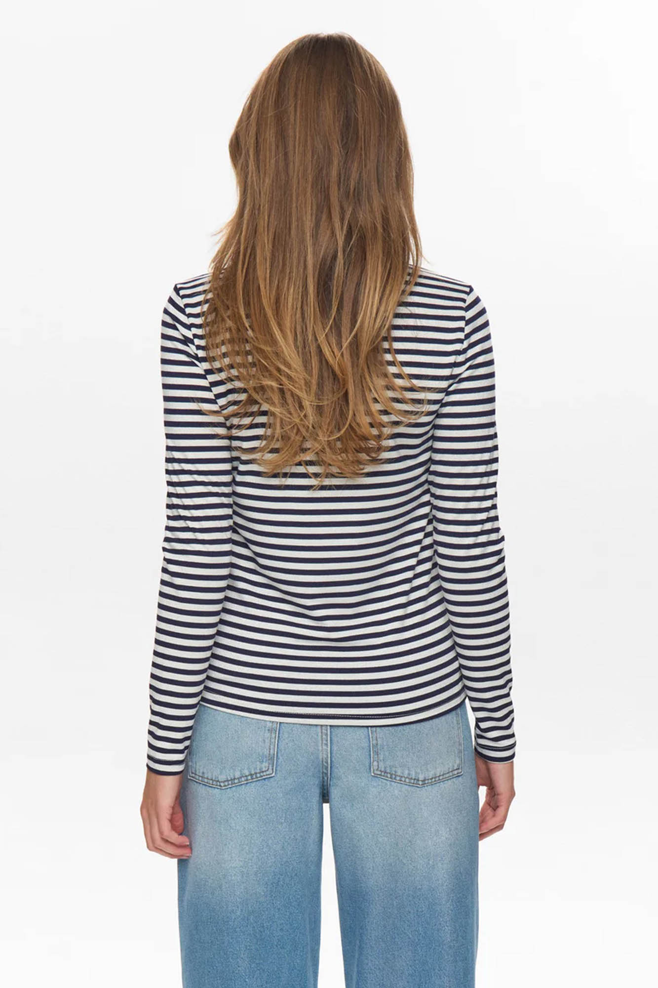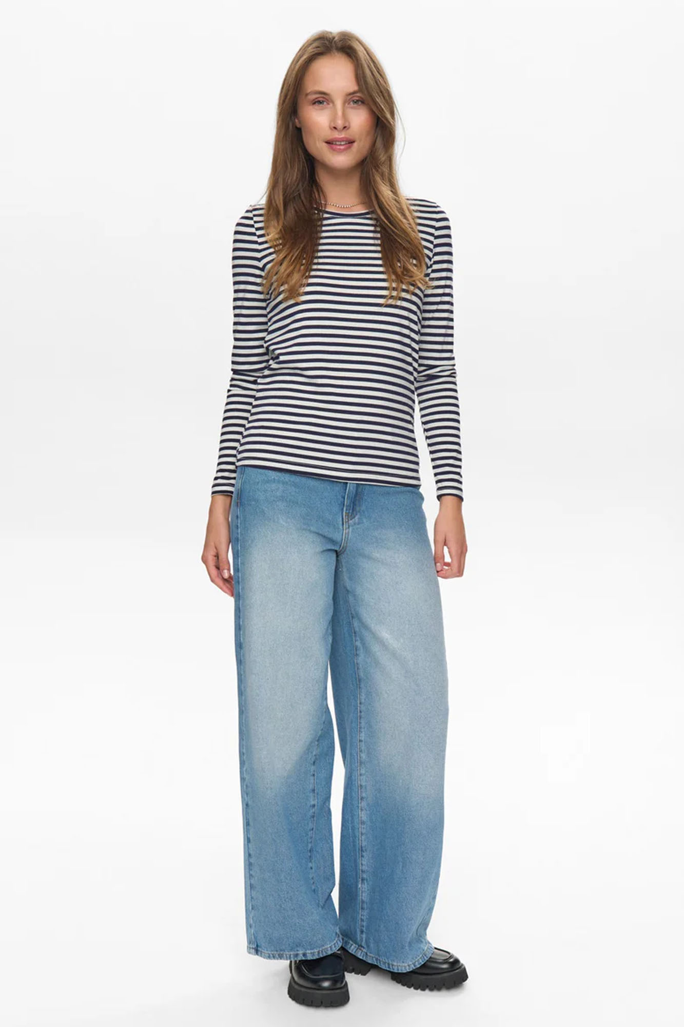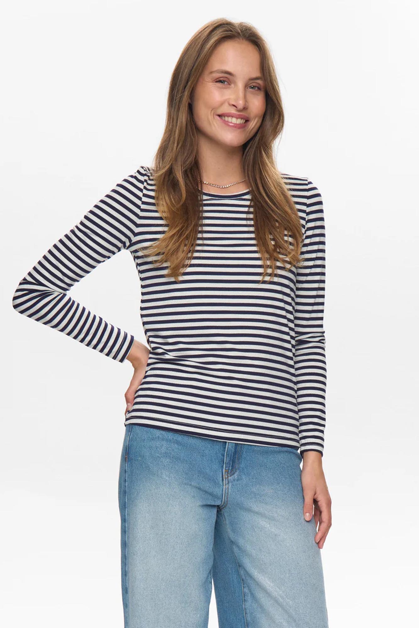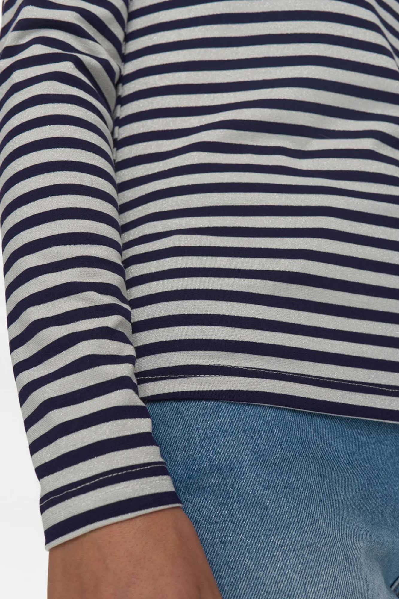 Camiseta de rayas horizontales en azul marino y plateado.