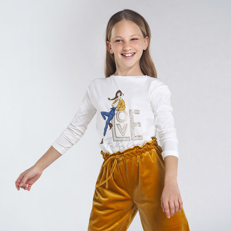 Camiseta de manga larga para chica de 8 a 16 años confeccionada con algodón sostenible. Cuello redondo. Suave tejido de algodón elástico. Elementos de adorno: dibujo en la parte delantera, glitter, texto en el delantero de la prenda.