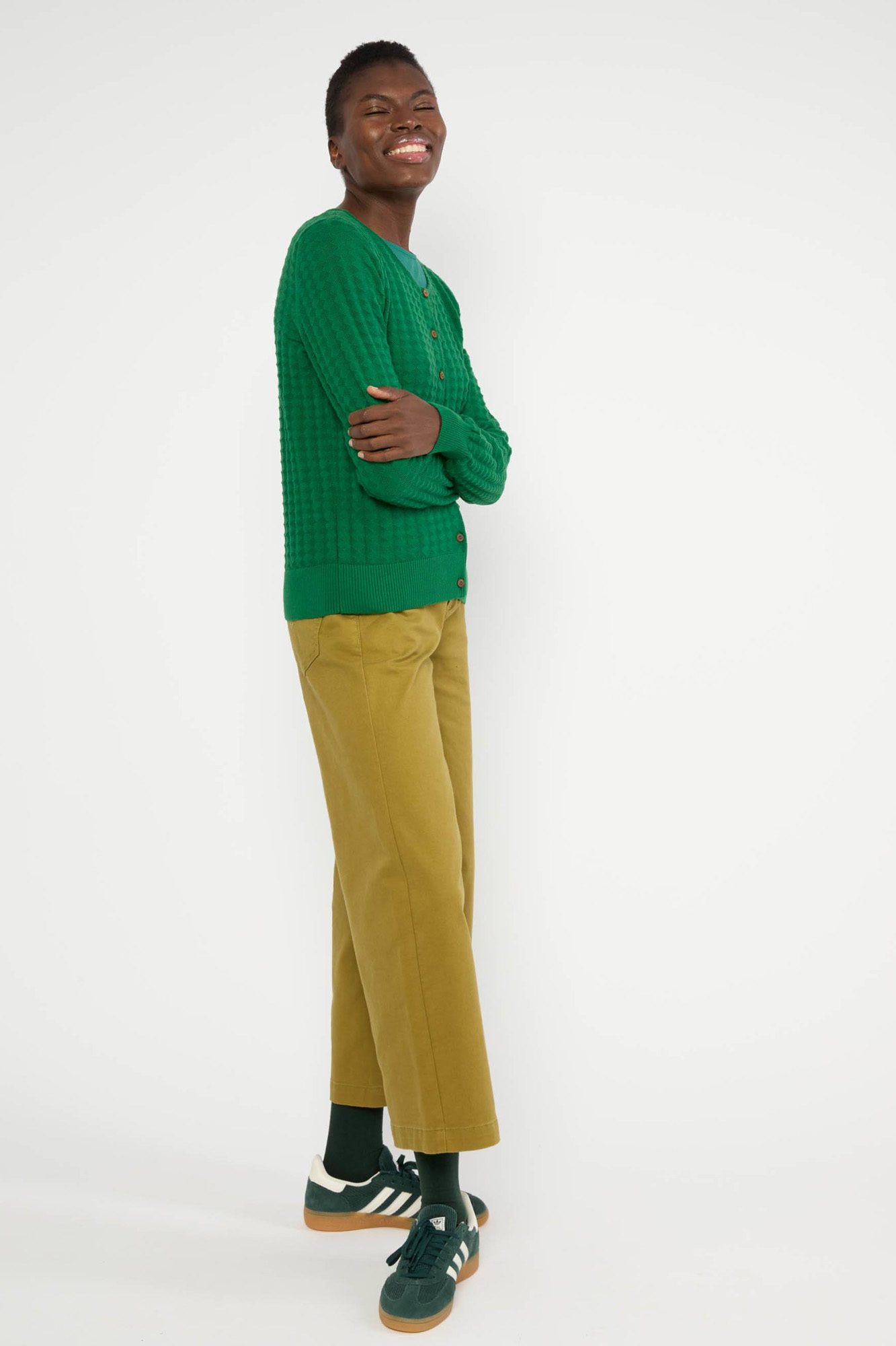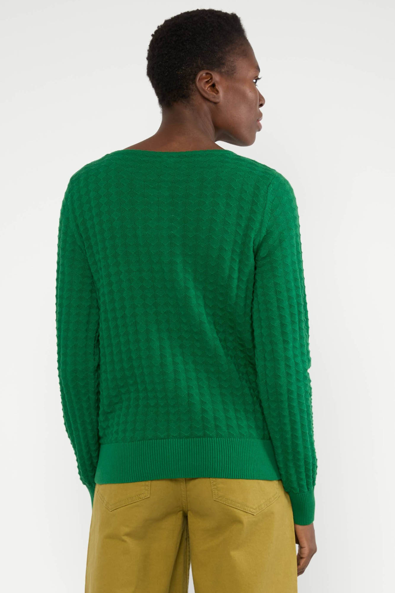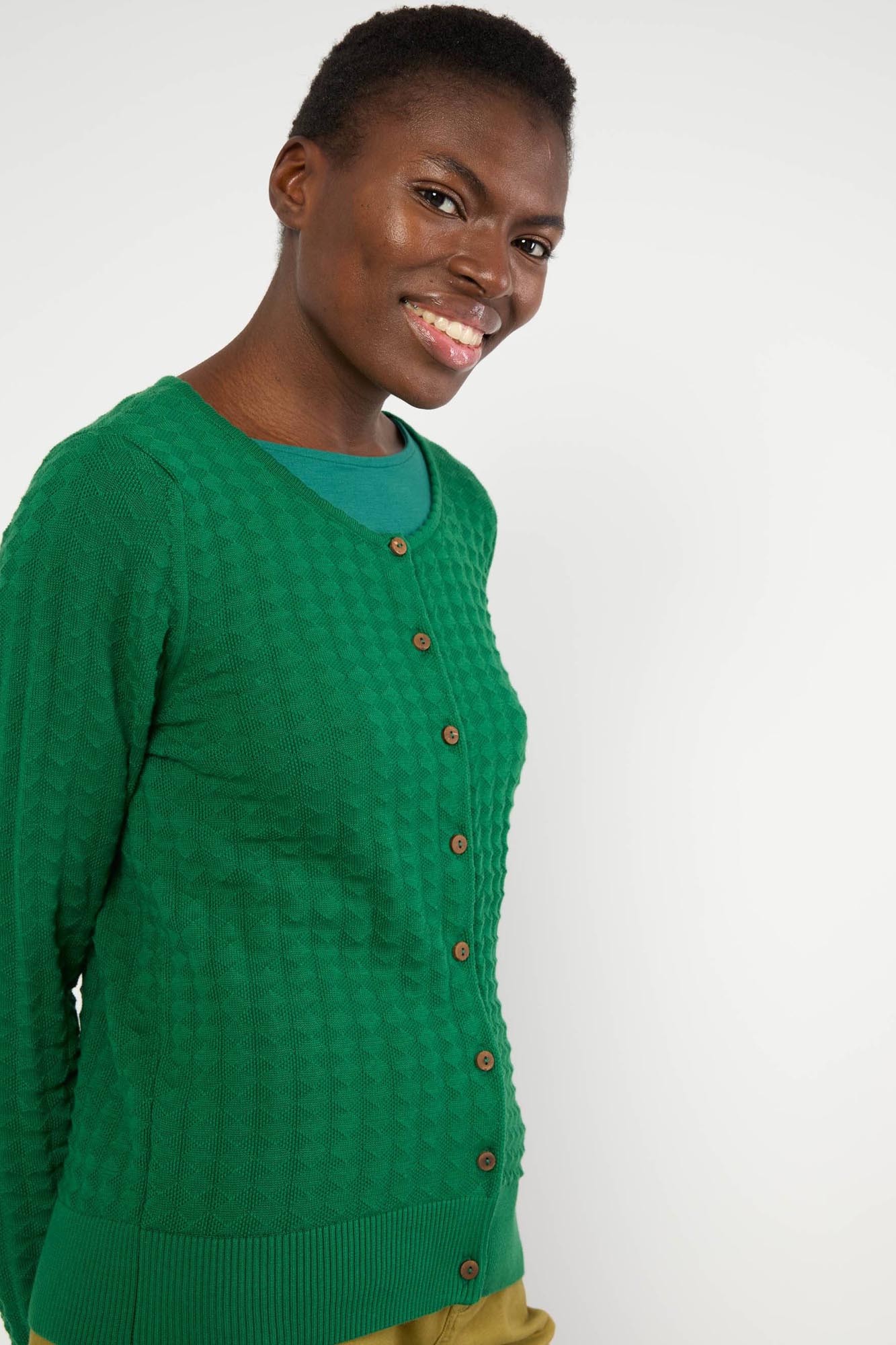 Botonadura en el delantero y botones hechos de coco.