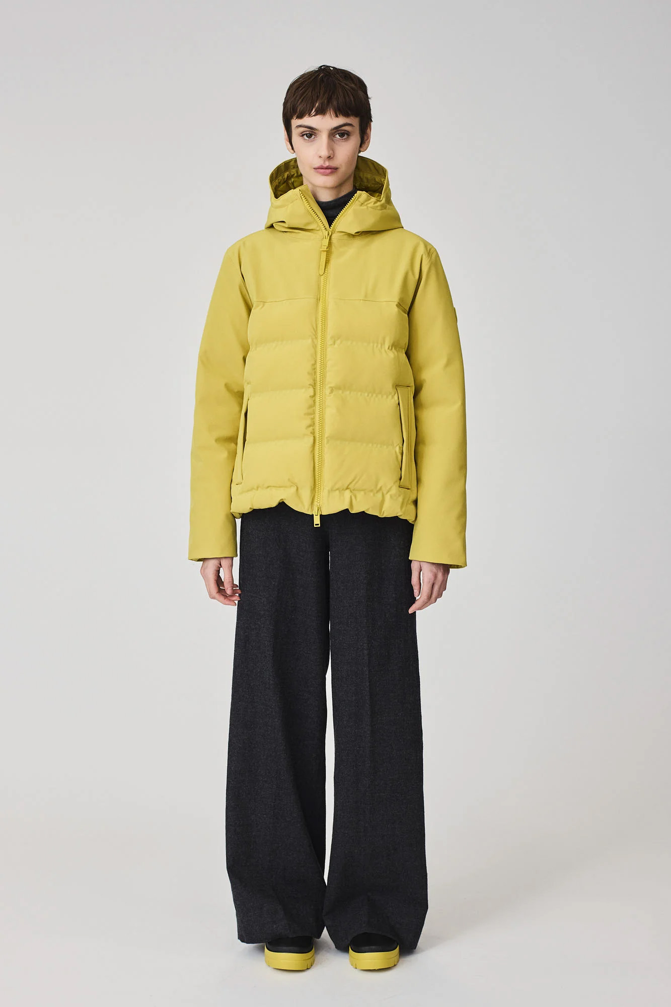 Abrigo corto con silueta A y largo aproximado a la altura de la cadera.