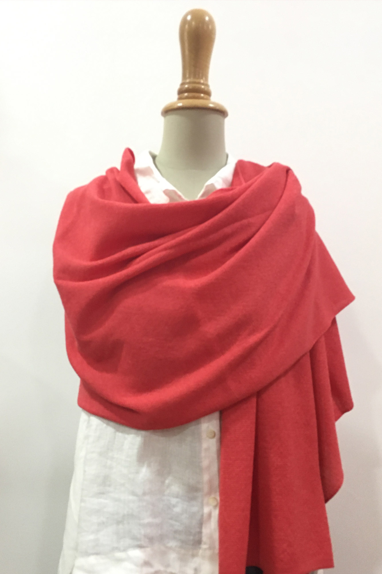 Precioso pañuelo de punto de arroz tejido con hilo 100% merino extrafino en color coral.