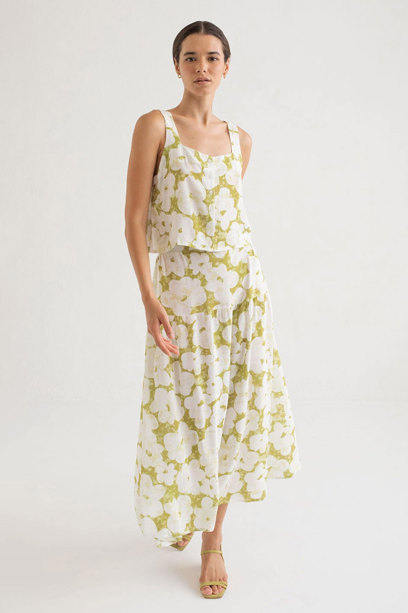 Falda larga estampada en tonos verde pistacho y blanco.