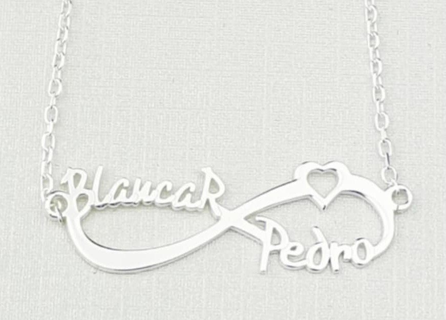 Personaliza tu preciosa gargantilla infinito con 2 nombres y corazón en plata de ley