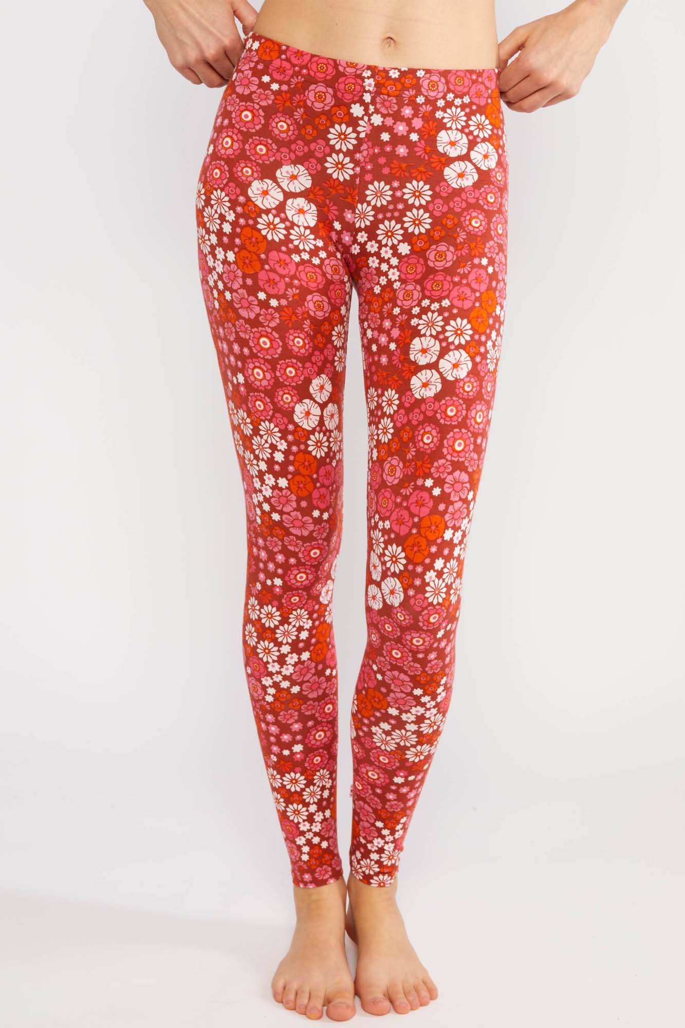 Legging de algodón orgánico con estampado floral en colores cálidos.