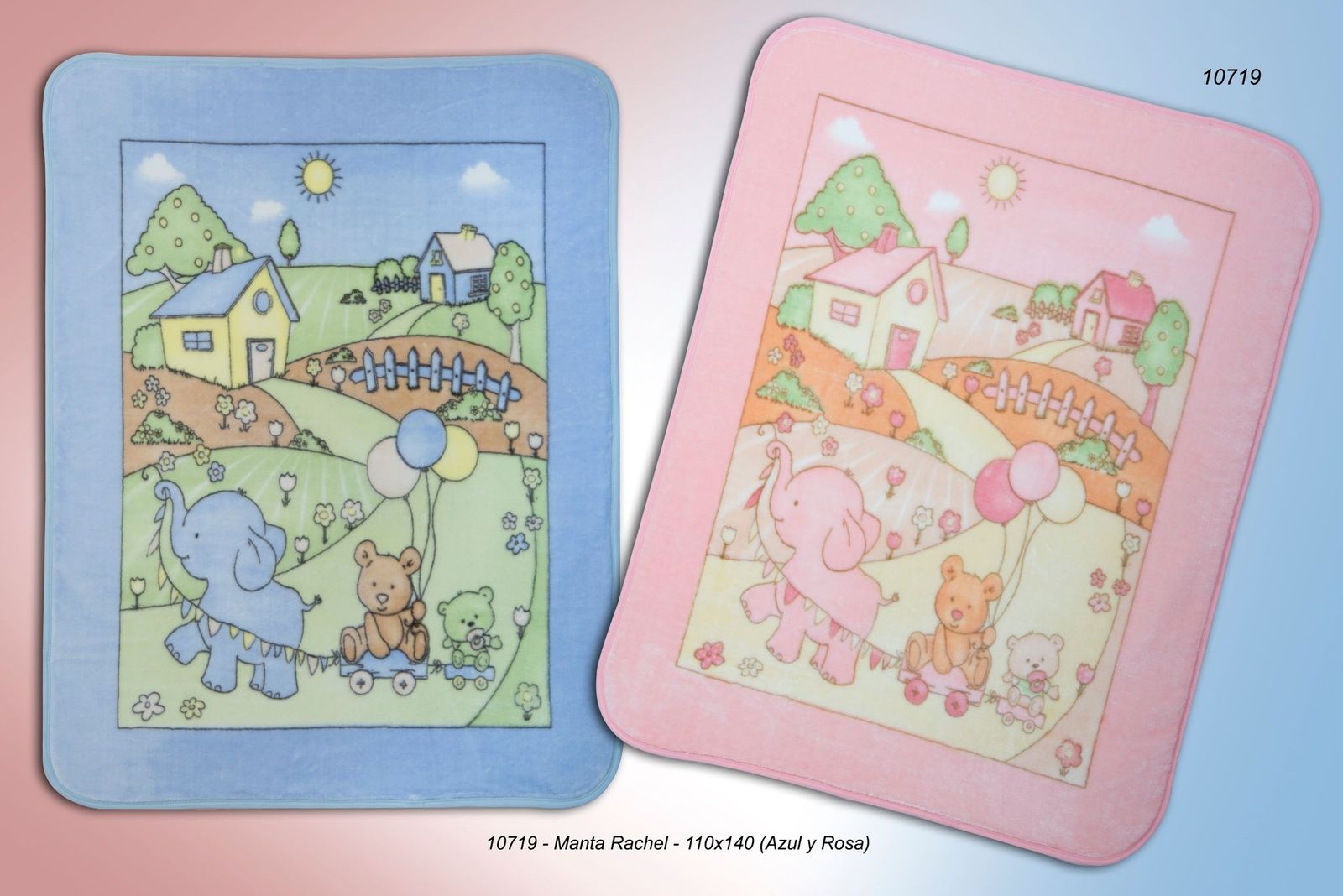 Cada detalle de esta manta ha sido cuidadosamente pensado para enamorar tanto a padres como a bebés. En el centro del diseño encontramos una tierna escena campestre protagonizada por un elefante sonriente, un osito juguetón y un pequeño osito panda, todos viajando juntos sobre ruedas mientras sujetan globos de colores pastel. Este diseño no solo estimula la imaginación del bebé, sino que también transmite paz, alegría y armonía, creando un ambiente propicio para el descanso y la tranquilidad.