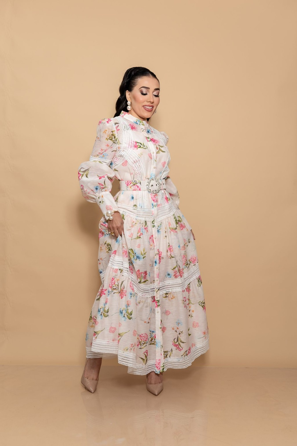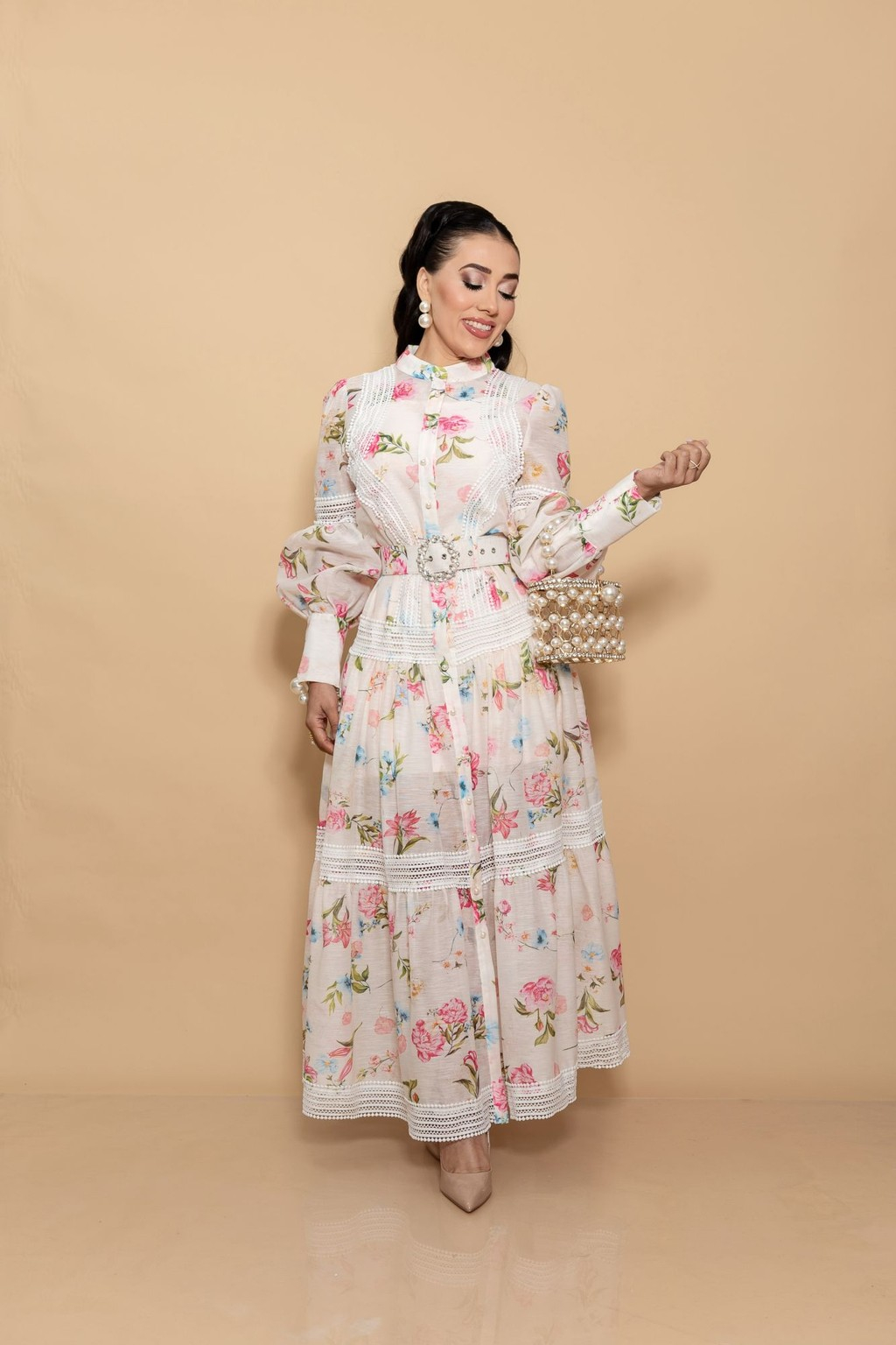 El vestido presenta un delicado estampado floral en tonos suaves sobre un fondo claro, que combina con detalles de encaje blanco que recorren el cuerpo, las mangas y la falda en cortes horizontales. Este diseño resalta la silueta con una estructura de cintura marcada gracias a un cinturón decorativo con hebilla brillante, que añade un toque de glamour al conjunto.