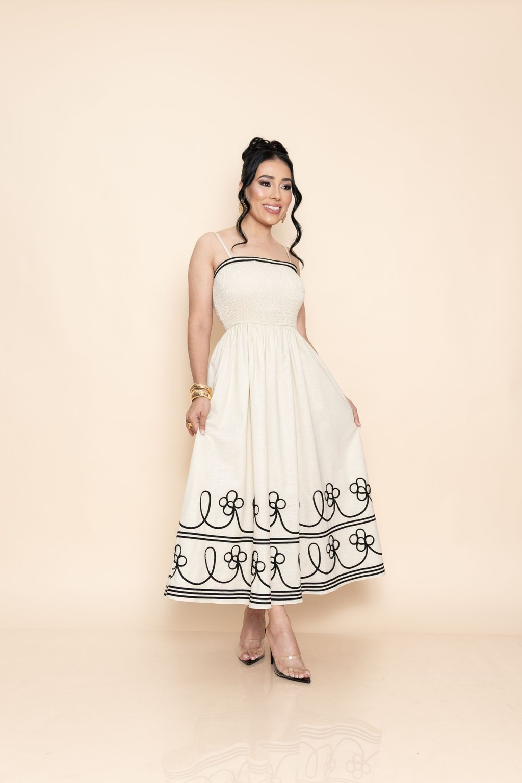 Está confeccionado en una tela suave, ligera y respirable, perfecta para el clima cálido de Nicaragua. Nuestra modelo lo combina con tacones transparentes y un bolso negro estructurado, demostrando cómo podés elevar este look con los accesorios adecuados para lucir fresca, moderna y segura.