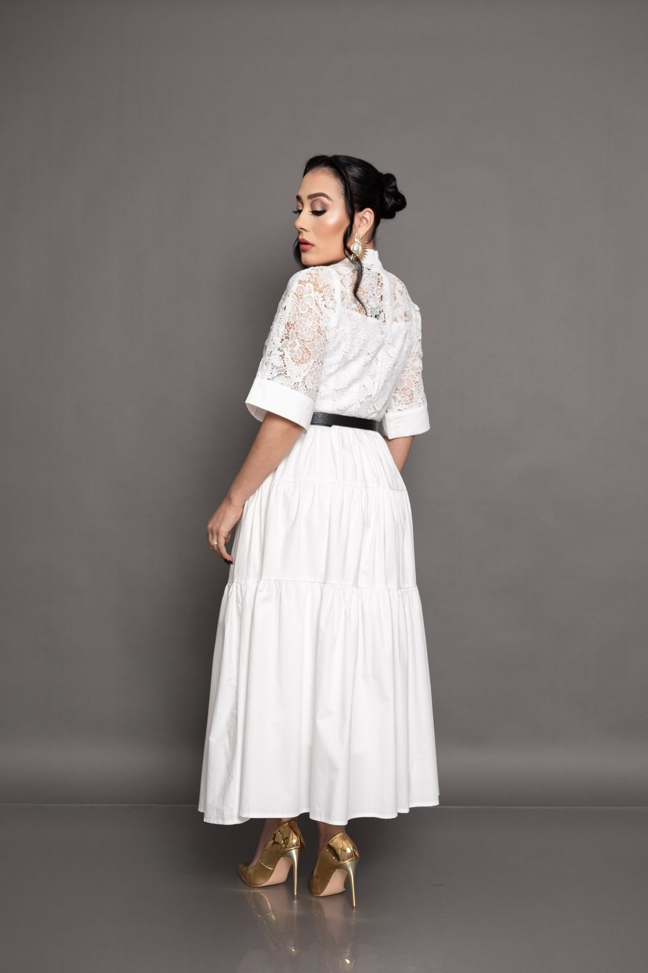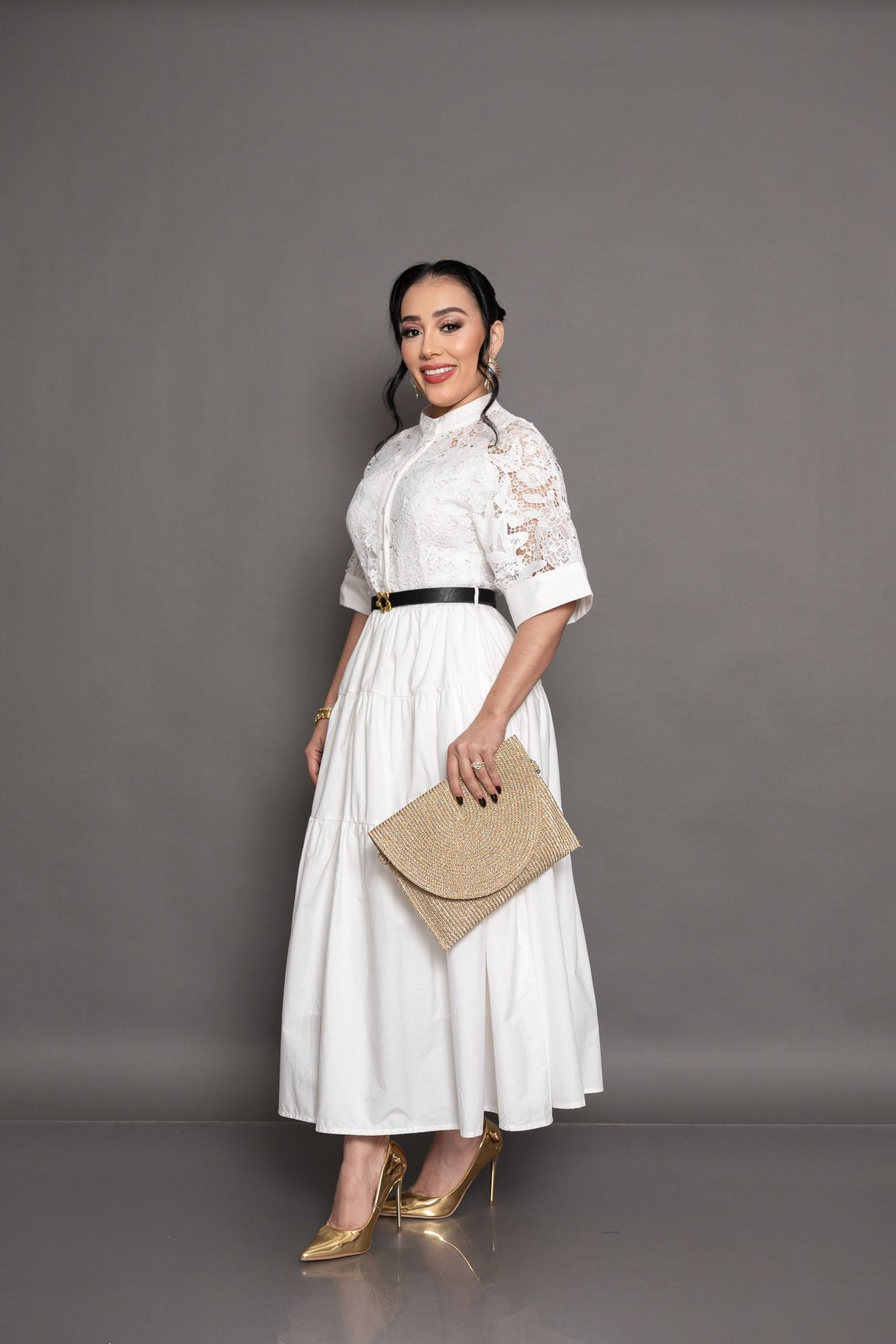 Luce impecable y sofisticada con este vestido blanco elegante Jireh Fashion, ideal para ocasiones especiales donde quieras destacar con clase. Este diseño exclusivo de nuestra marca nicaragüense combina la frescura del blanco con detalles delicados en encaje sobre la parte superior, que añaden un toque romántico y femenino. Su falda amplia de corte largo proporciona movimiento y elegancia, mientras que las mangas tres cuartos y el cuello camisero le otorgan un estilo moderno y refinado.