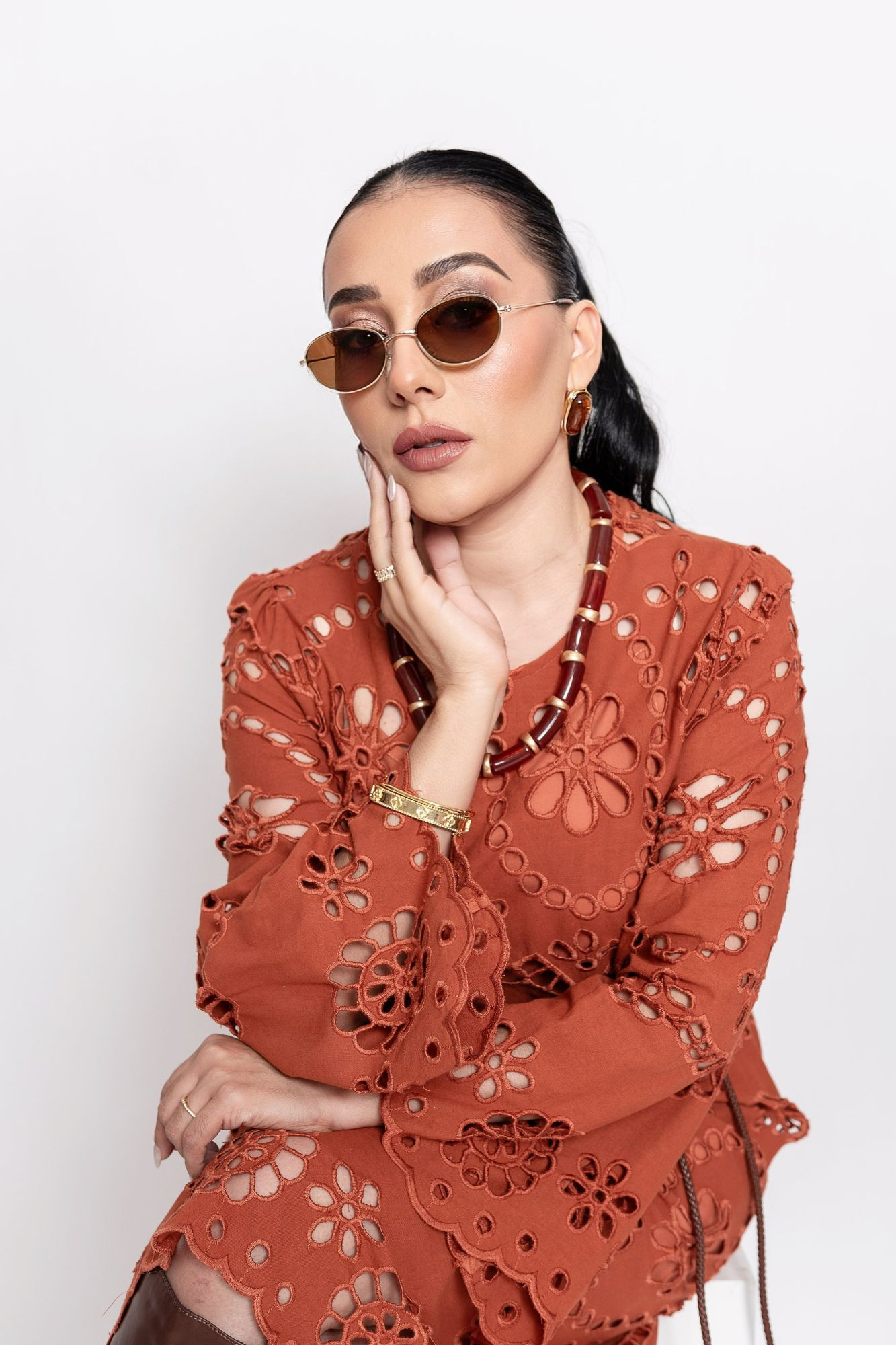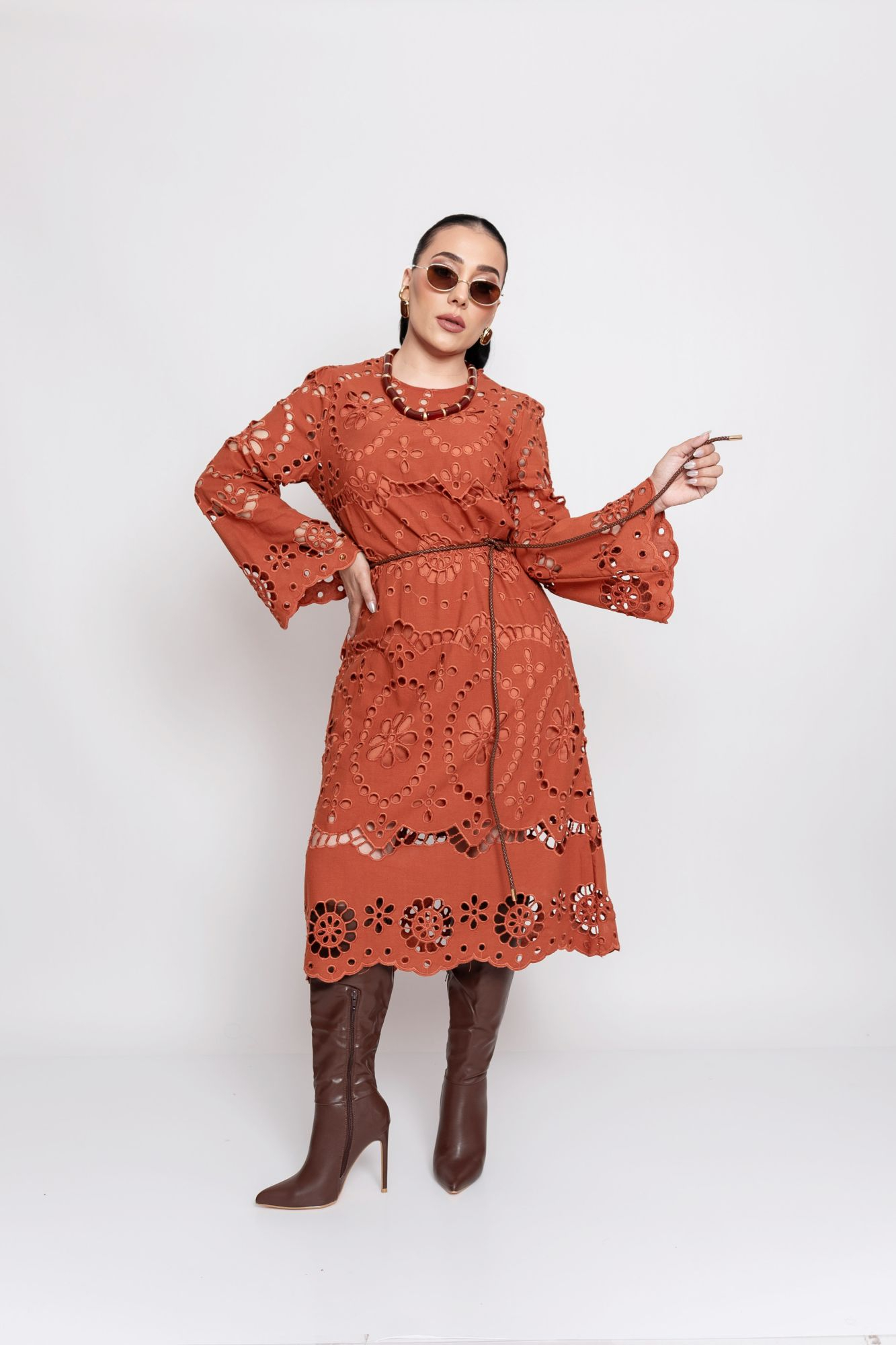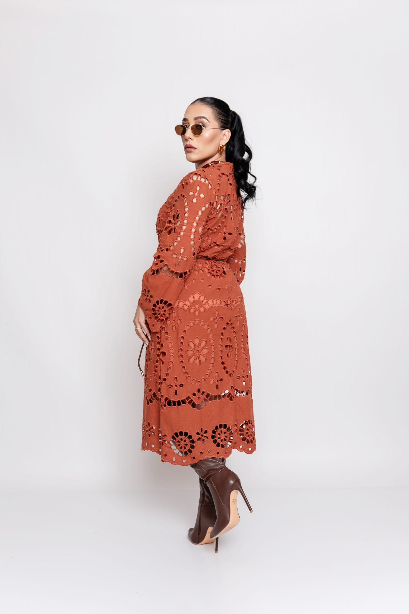 Puedes combinar el vestido terracota calado de manga larga con botas altas, como se muestra en la imagen, o bien con tacones clásicos y un bolso neutro para un enfoque más refinado. Además, si lo deseas, puedes añadir un cinturón delgado para marcar aún más la silueta y aportar un toque personalizado.