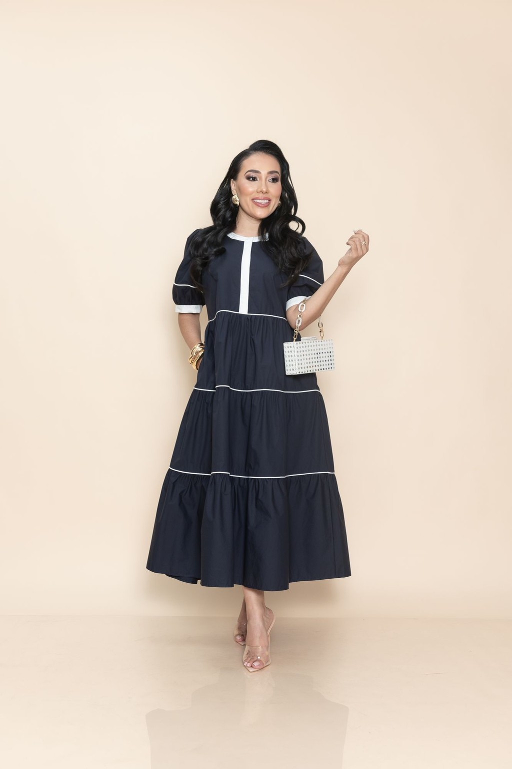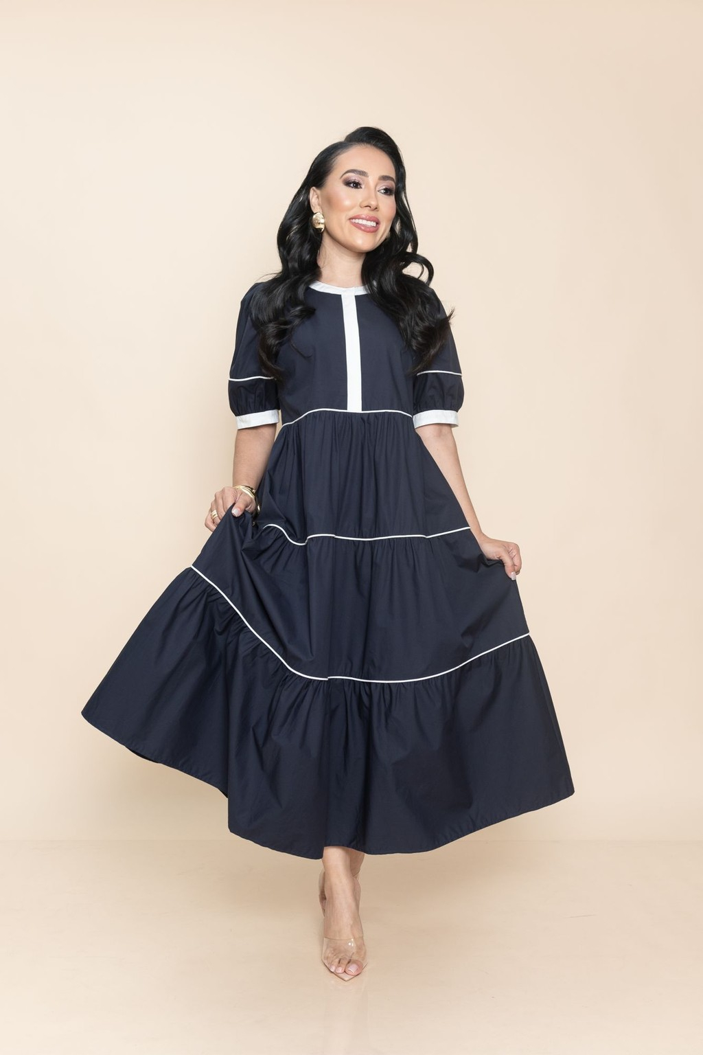 Lo más destacado de este vestido azul marino con detalles blancos son sus líneas blancas en los bordes de las mangas, cuello, y costuras que crean una estructura visual armoniosa y moderna. Es un diseño que logra equilibrio entre sobriedad y frescura, manteniendo un aire clásico pero actualizado.