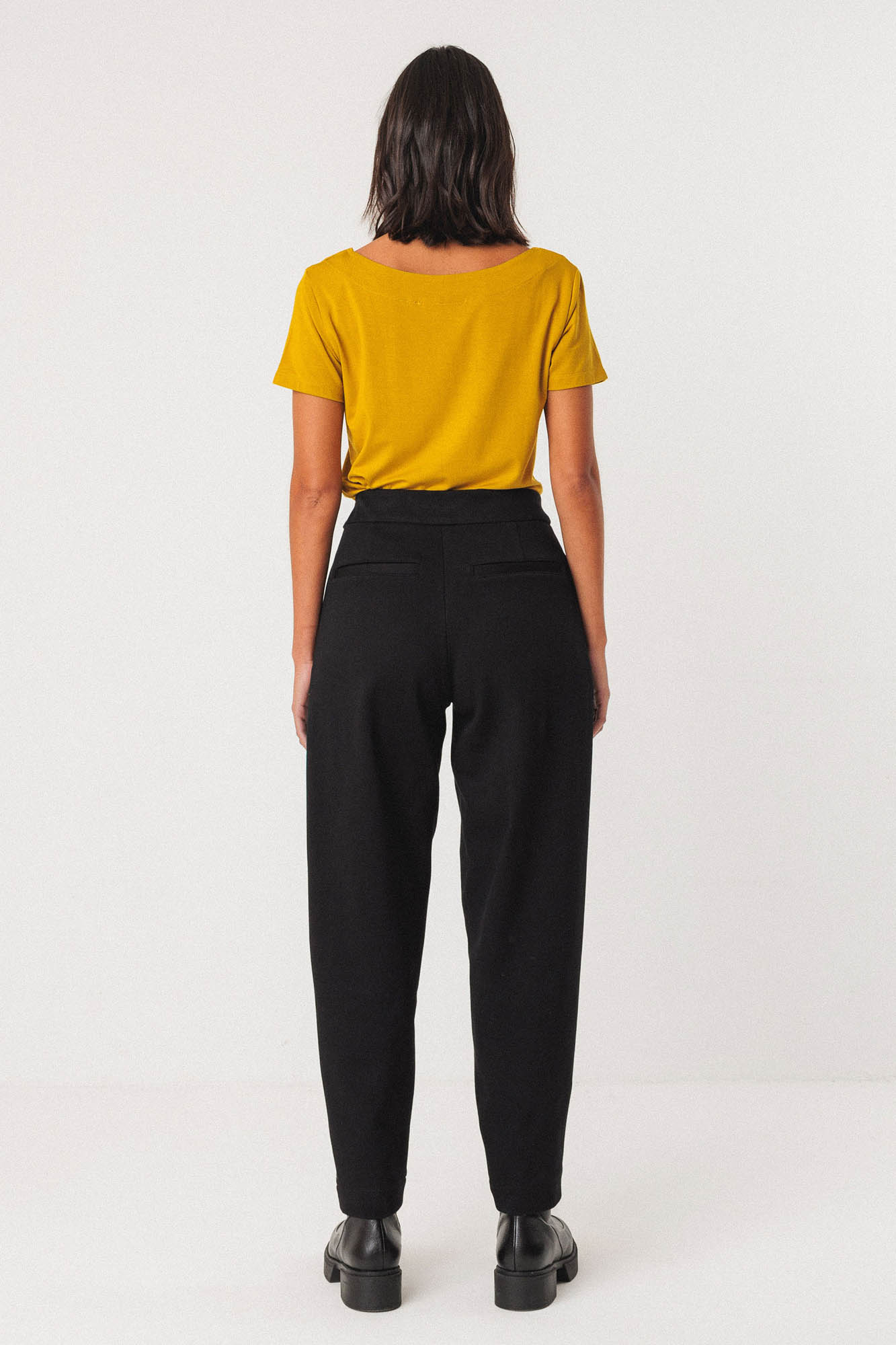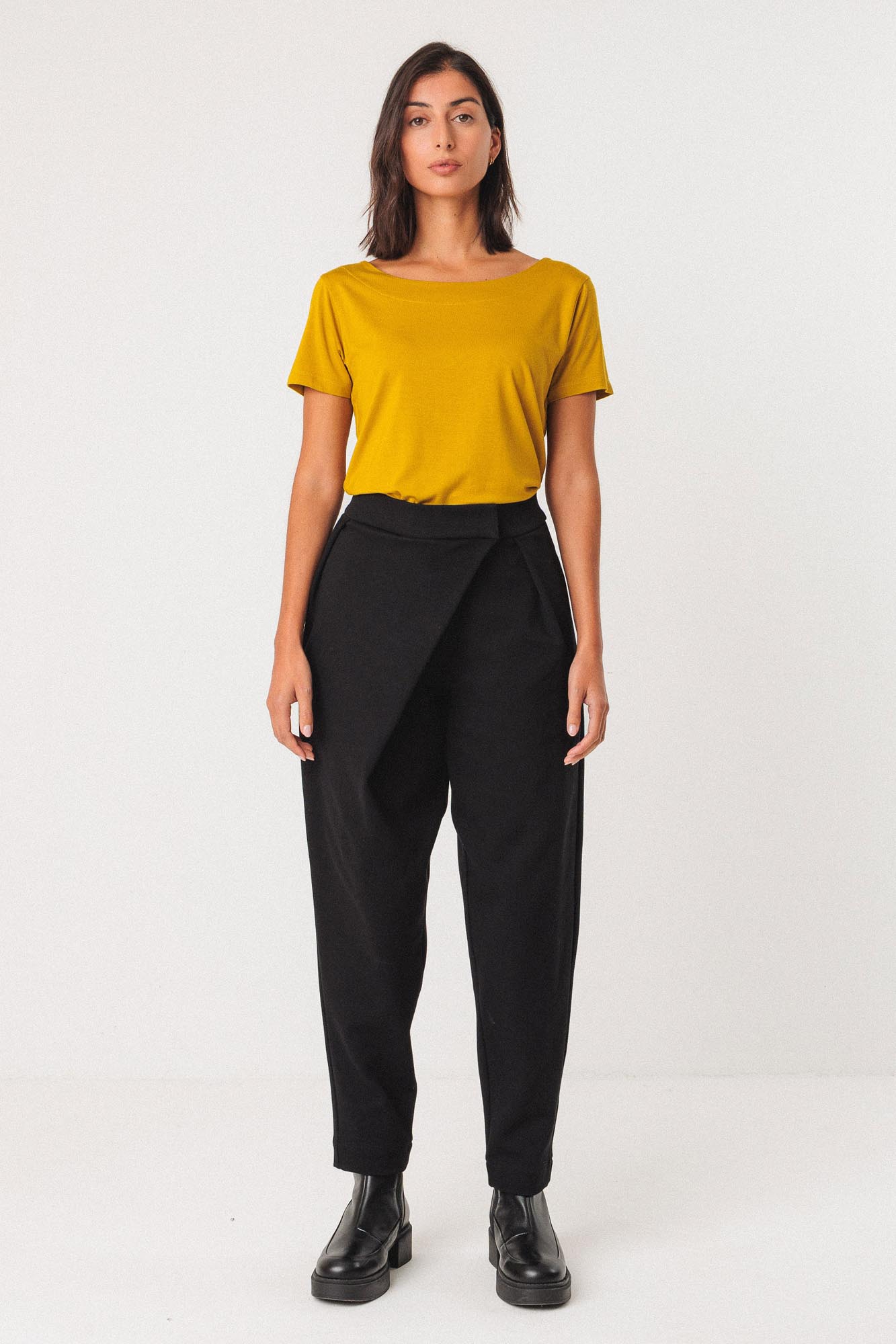 Pantalón asimétrico negro con largo hasta el tobillo.