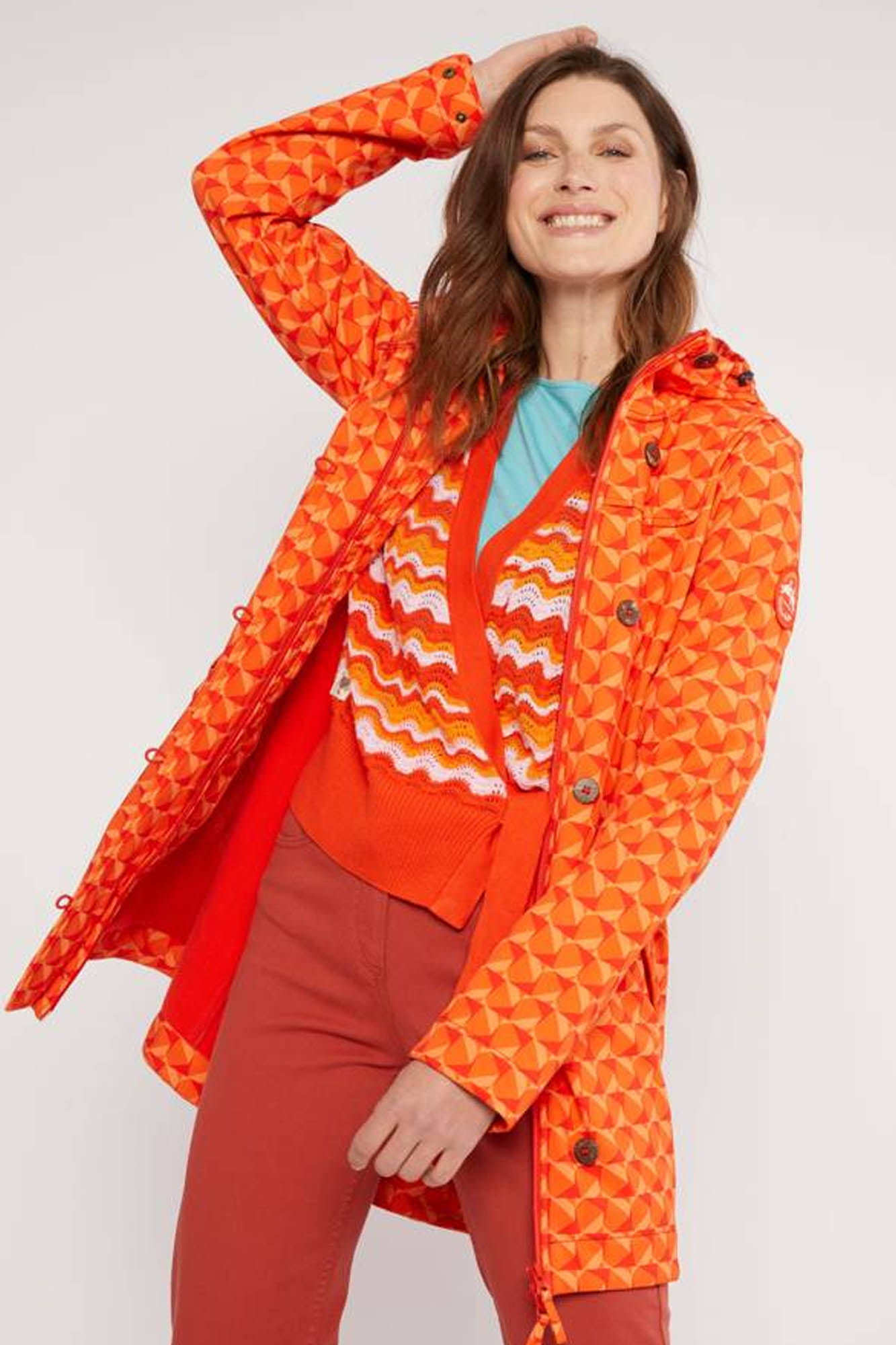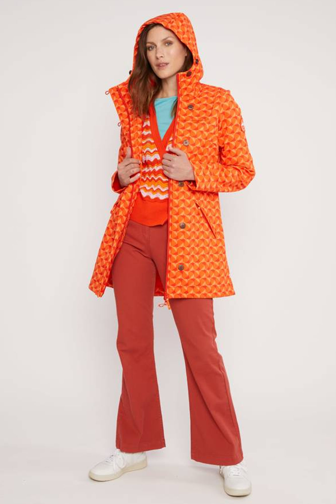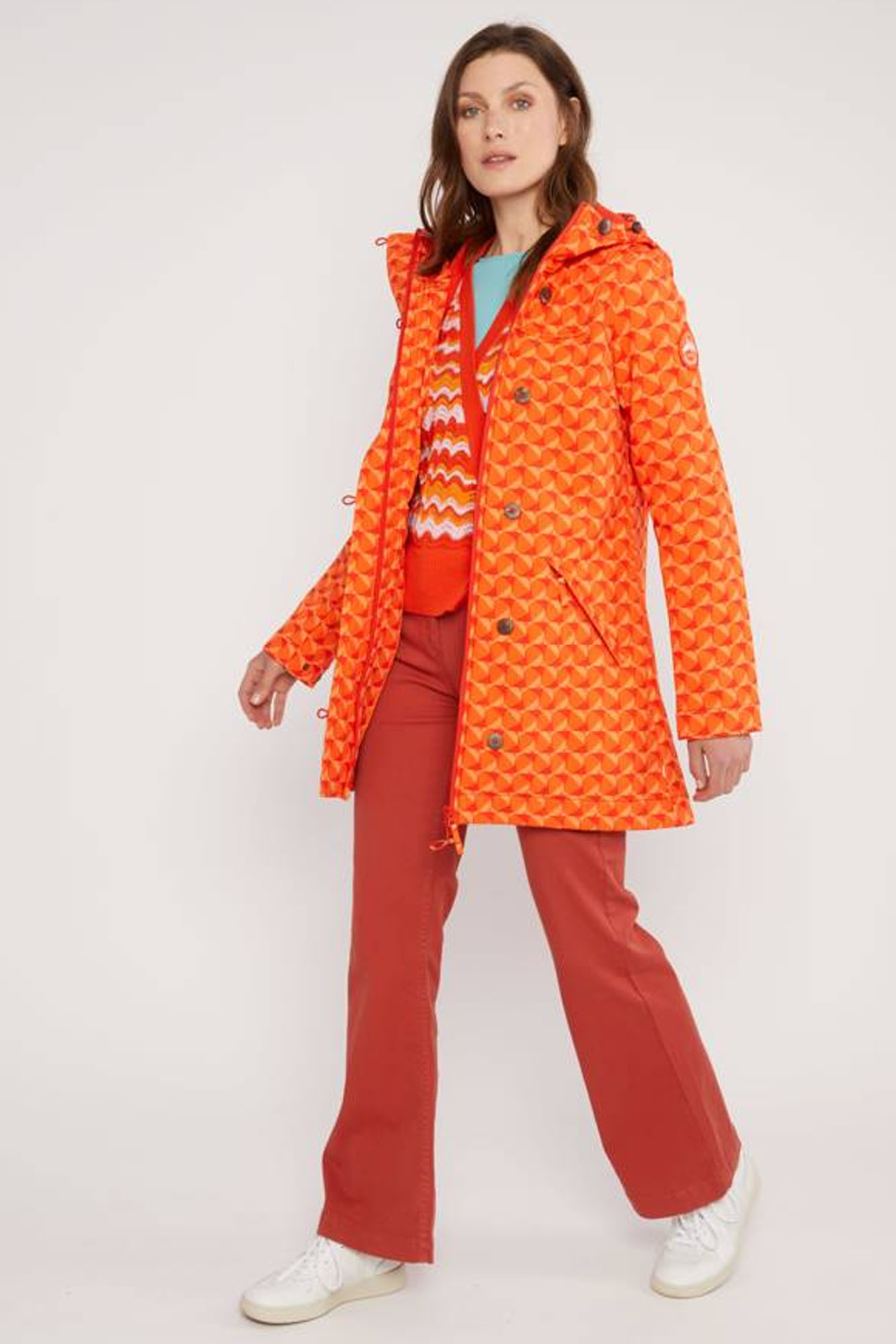 Es una prenda funcional y transpirable que se adapta a cualquier tipo de clima. Tiene capucha que se puede adaptar gracias a un cordón elástico.