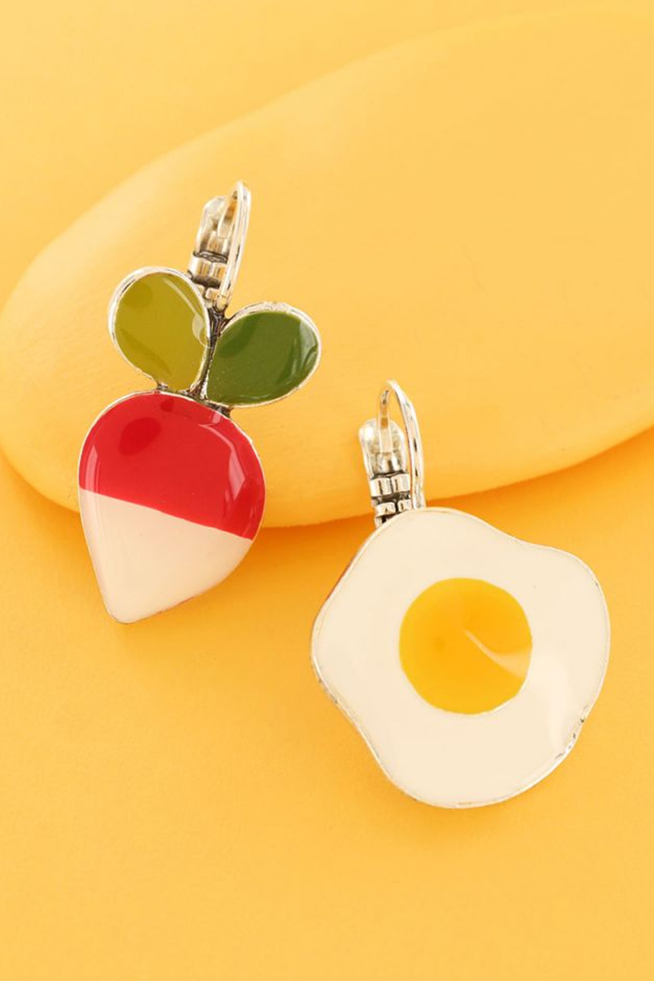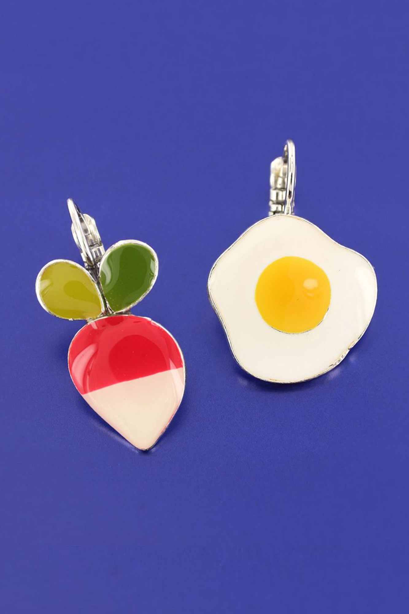 Representan un huevo frito y un rábano en una combinación asimétrica: en cada oreja llevarás un elemento distinto.