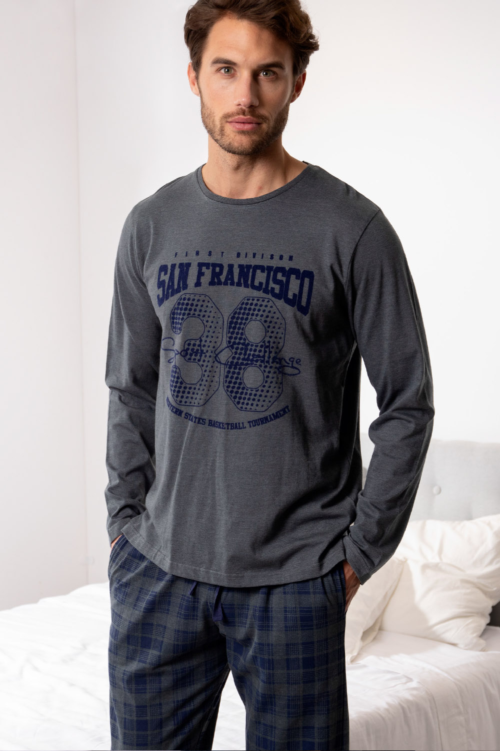 Parte superior: camiseta de manga larga en color gris oscuro con estampado frontal en azul marino que dice «SAN FRANCISCO 38», acompañado de otros textos en estilo universitario, lo que le da un aire retro y atlético.