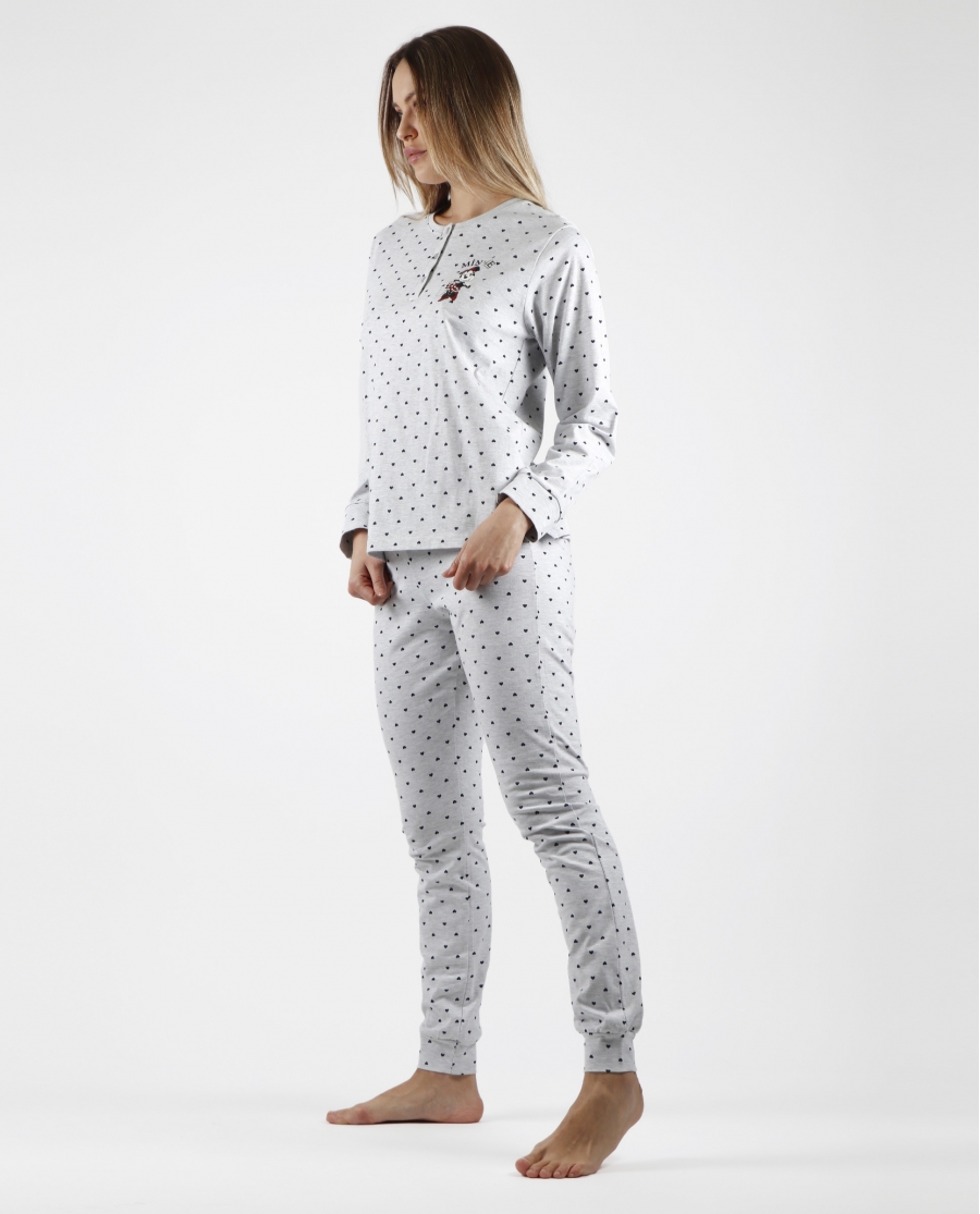 * Pijama de punto de algodón, de manga larga, cuello con tapeta con botones y pantalón largo.