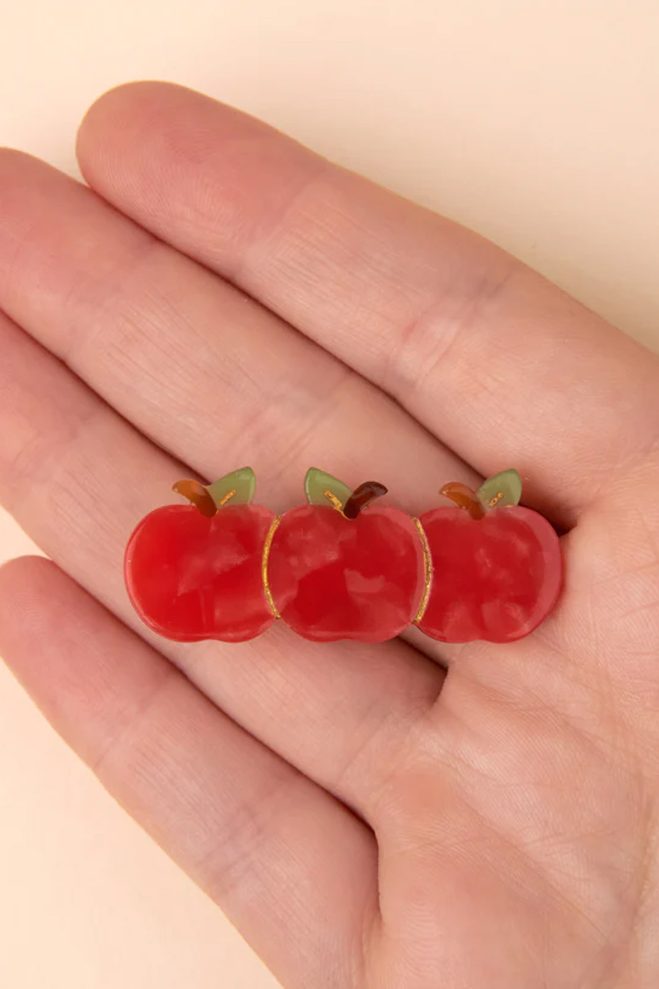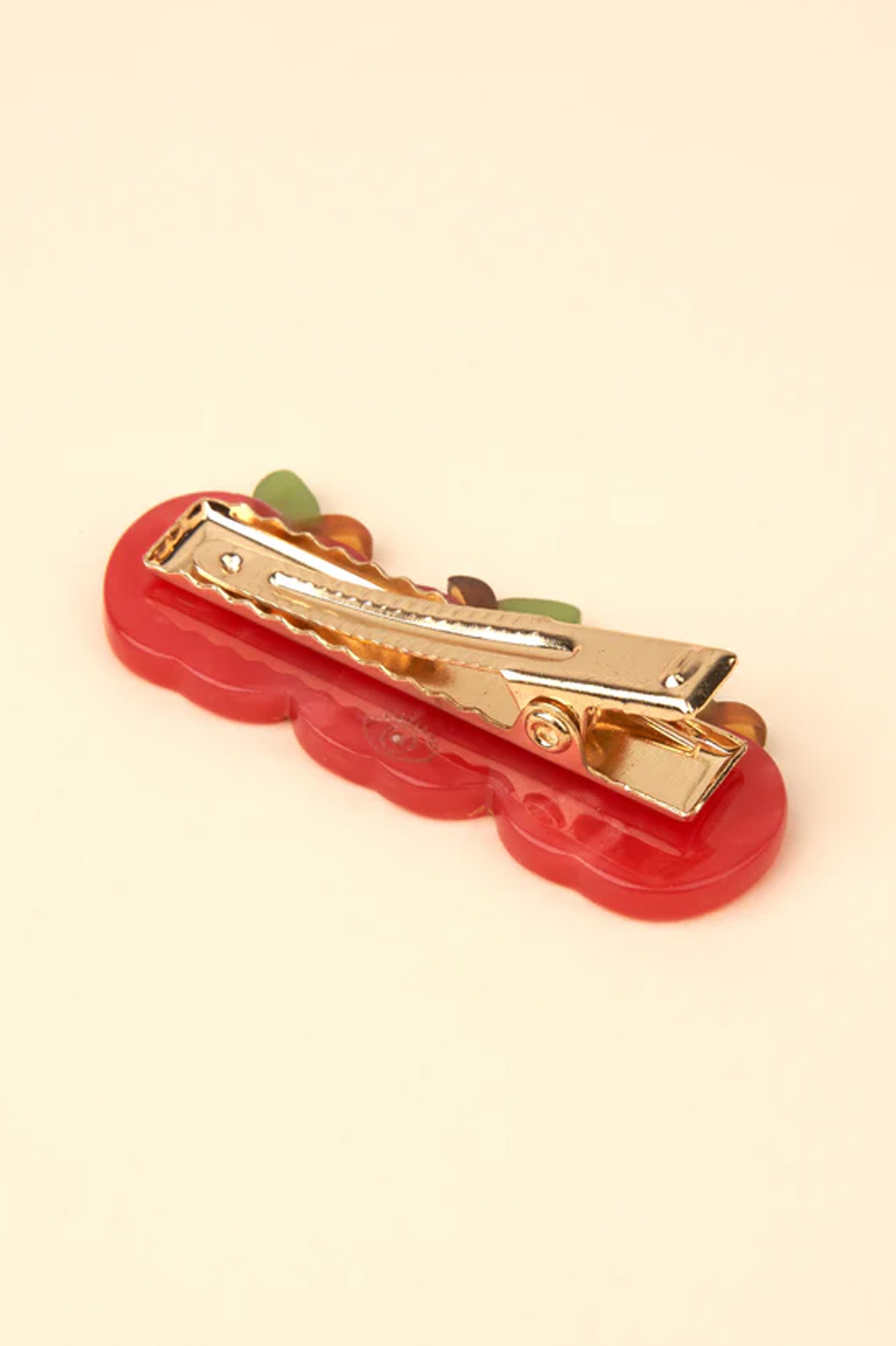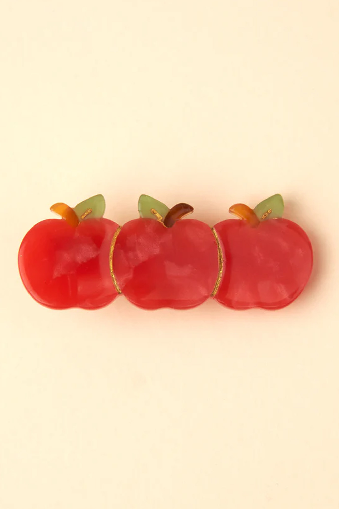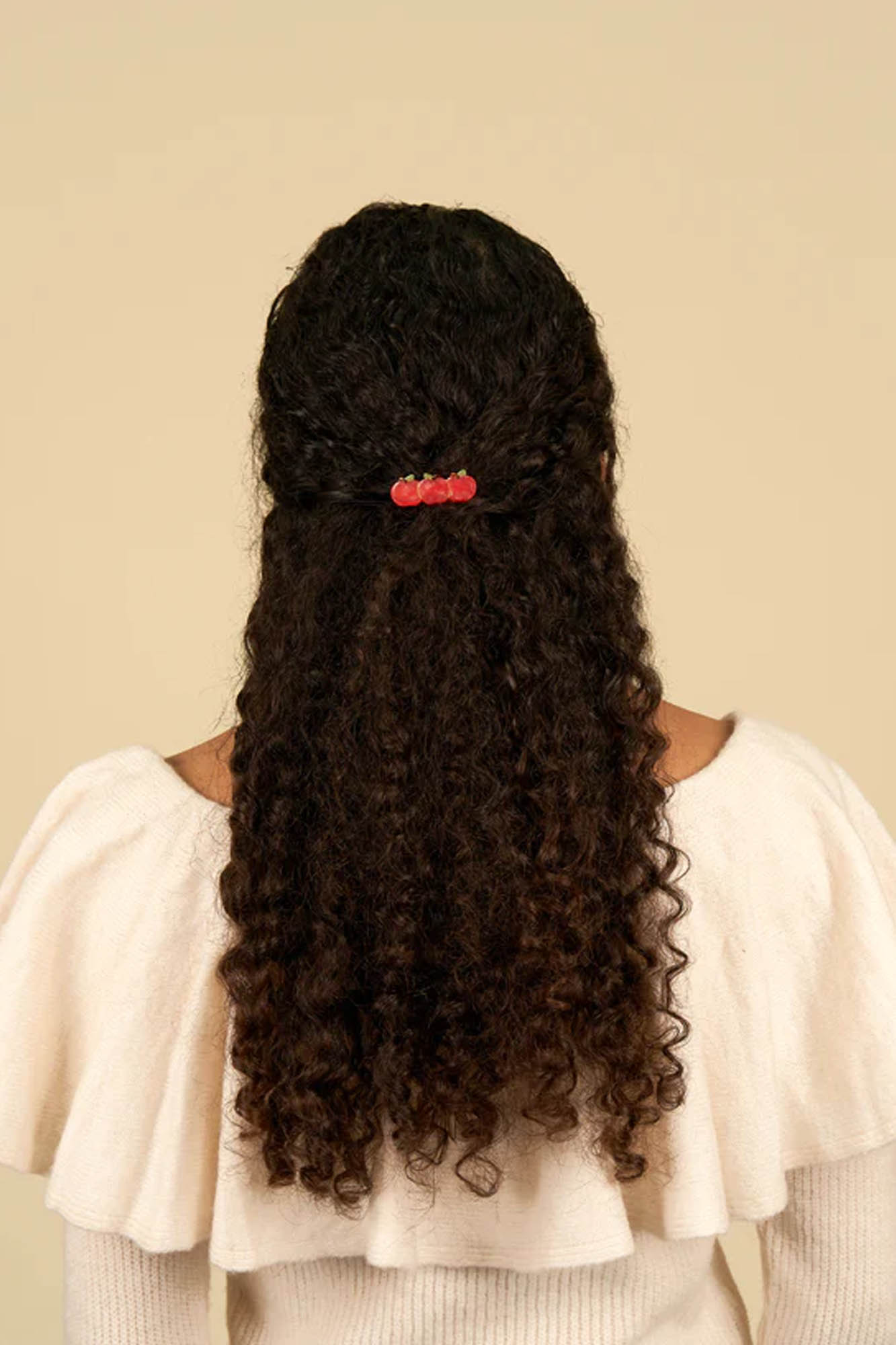 Pinza para el pelo tipo clip con diseño de manzanas rojas.