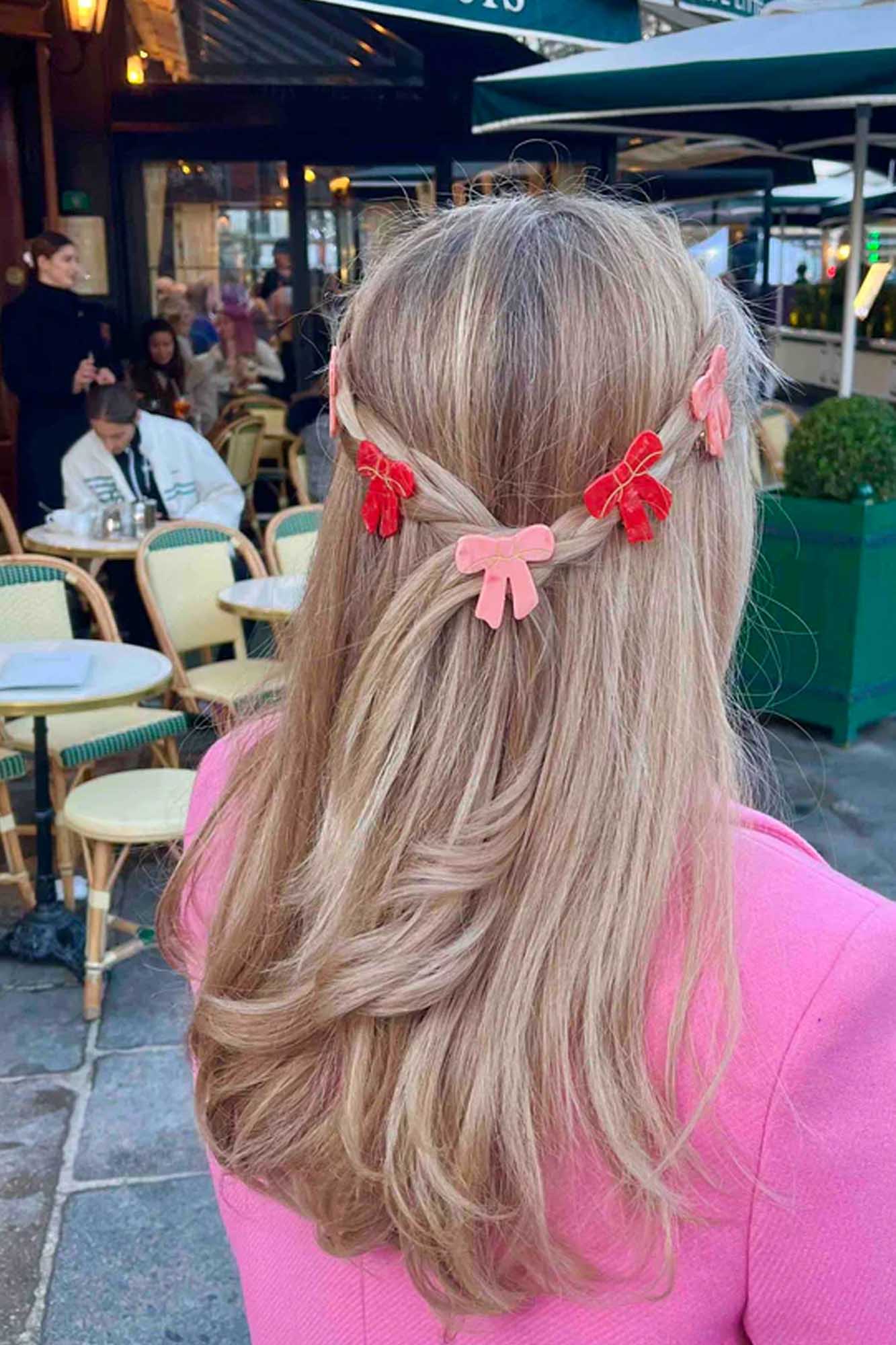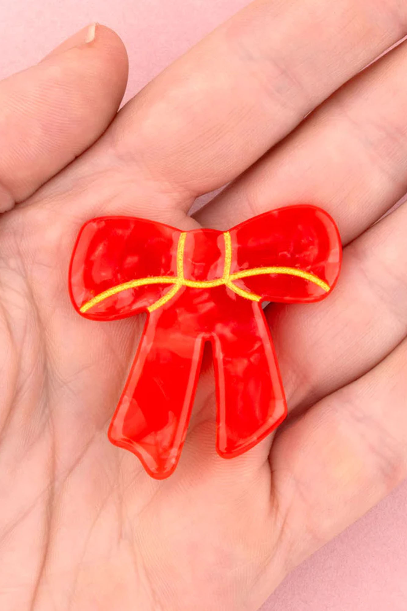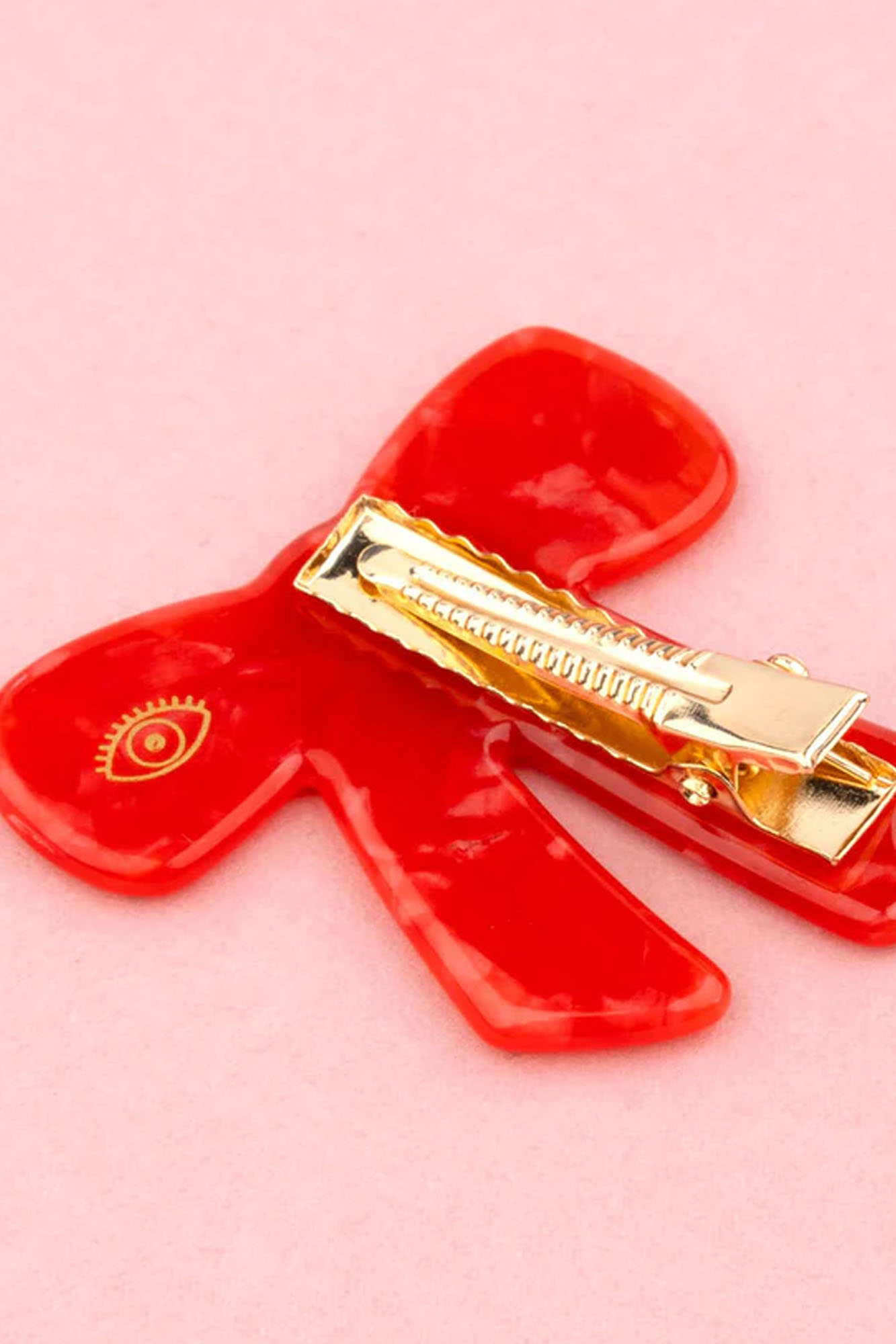 Pinza para el pelo tipo clip con diseño de lazo en color rojo.