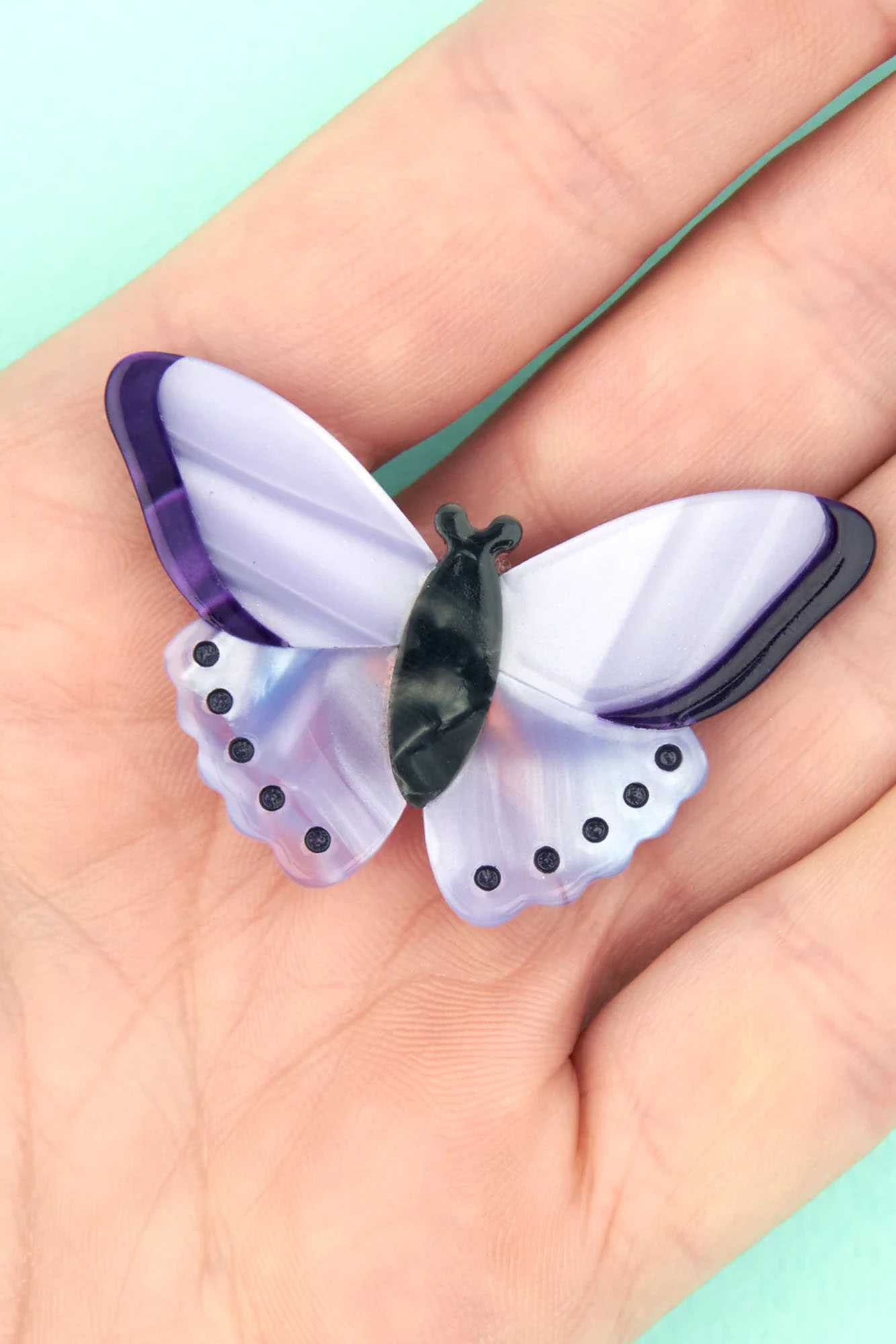 Pinza para el pelo tipo clip con diseño de mariposa en tono violeta.