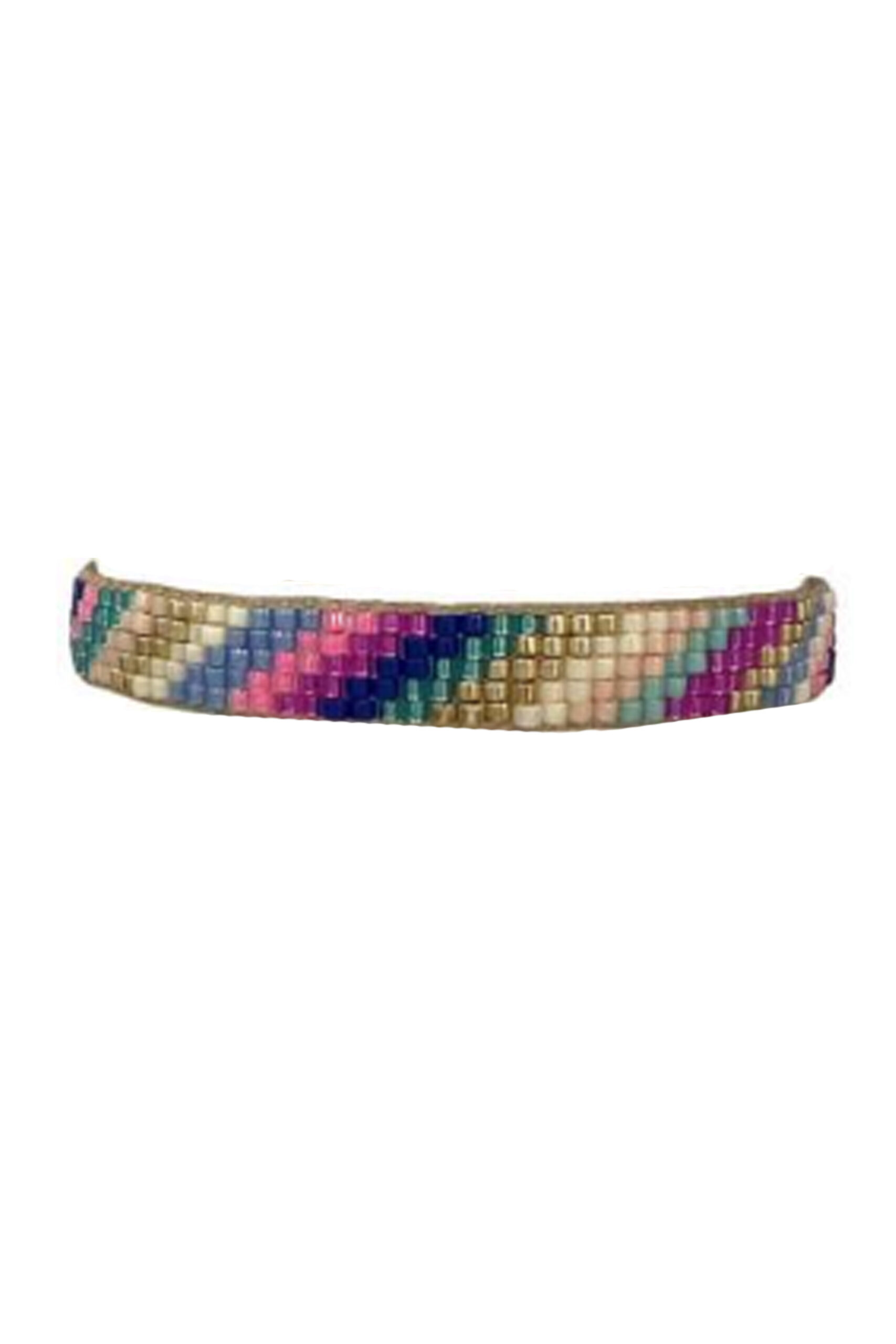 Preciosa pulsera hecha con cuentas de vidrio japonesas en tonos azules, rosas y dorados.
