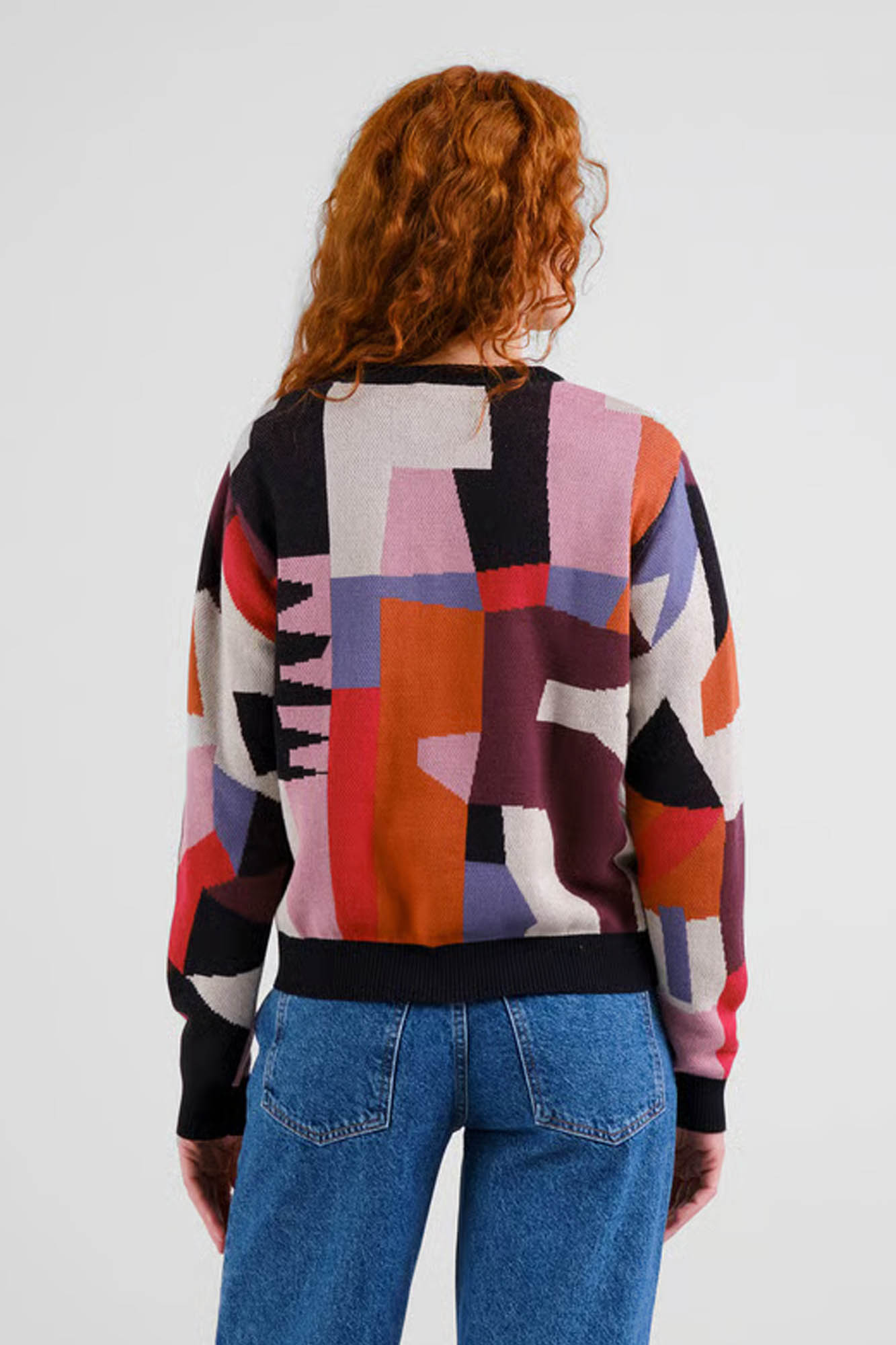 Con un colorido estampado geométrico.