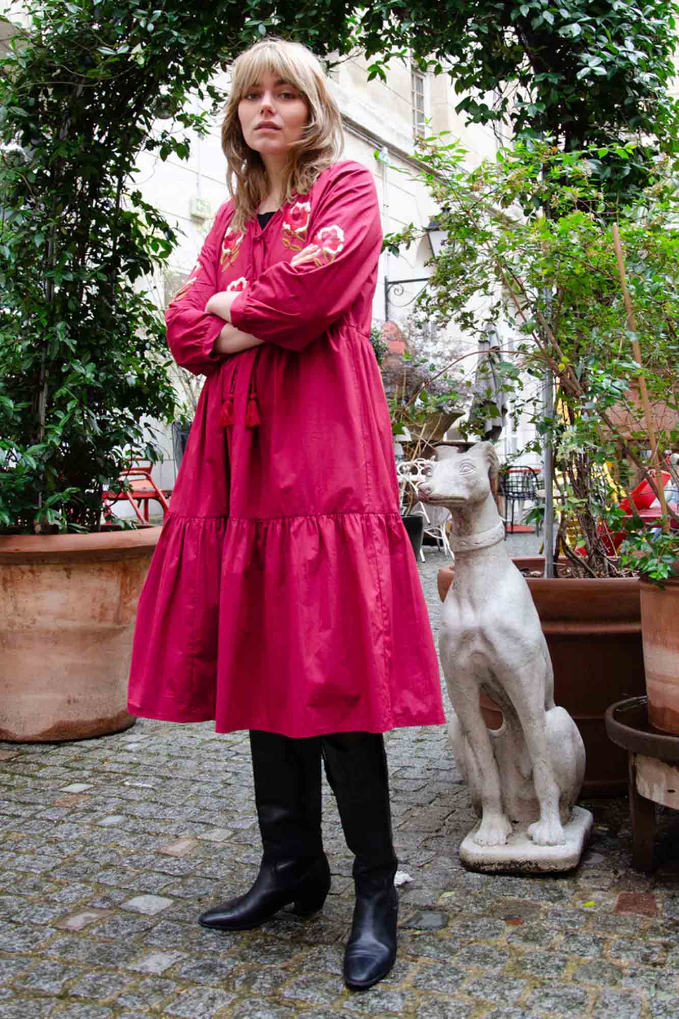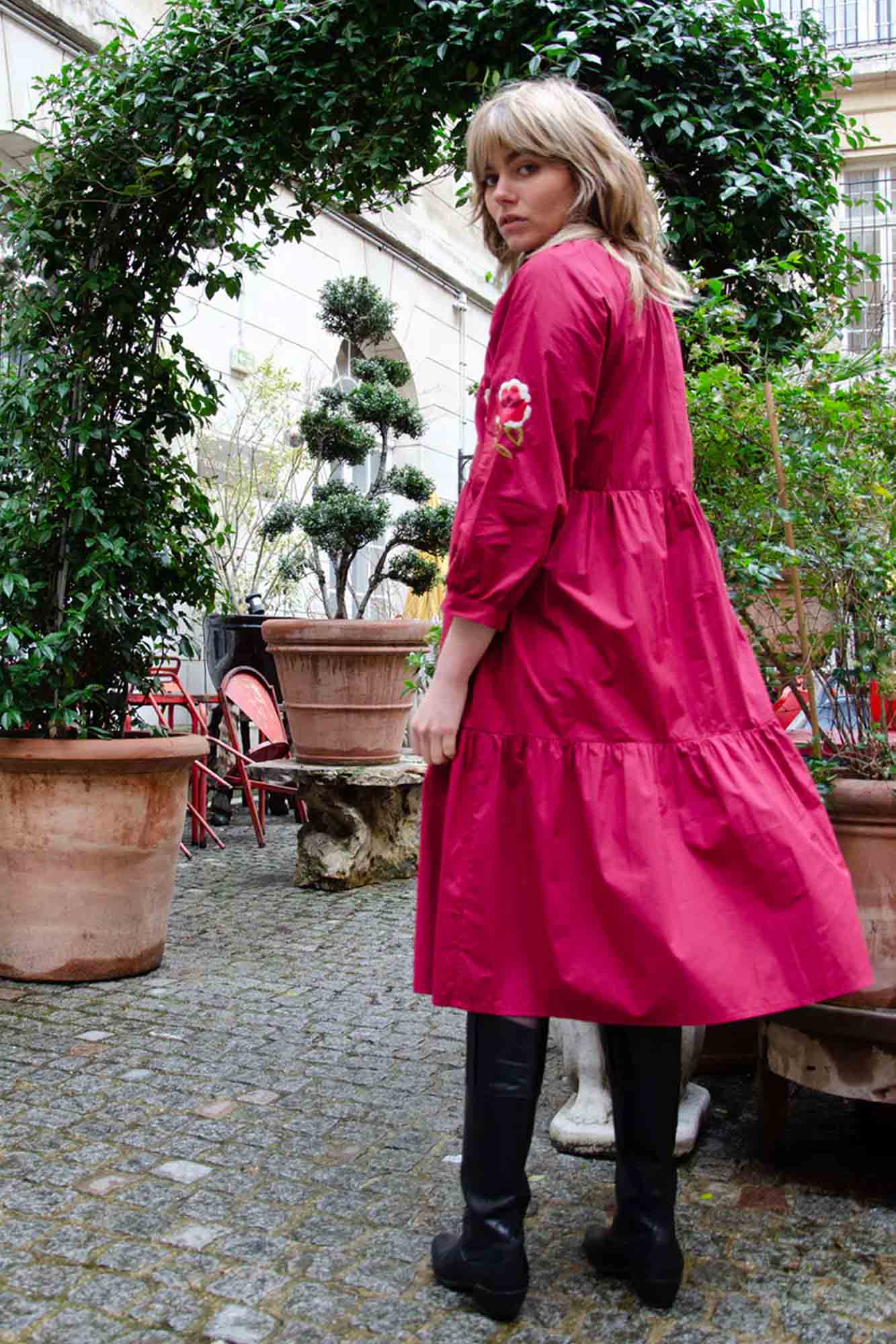 Vestido de algodón en color rojo inenso con flores bordadas.