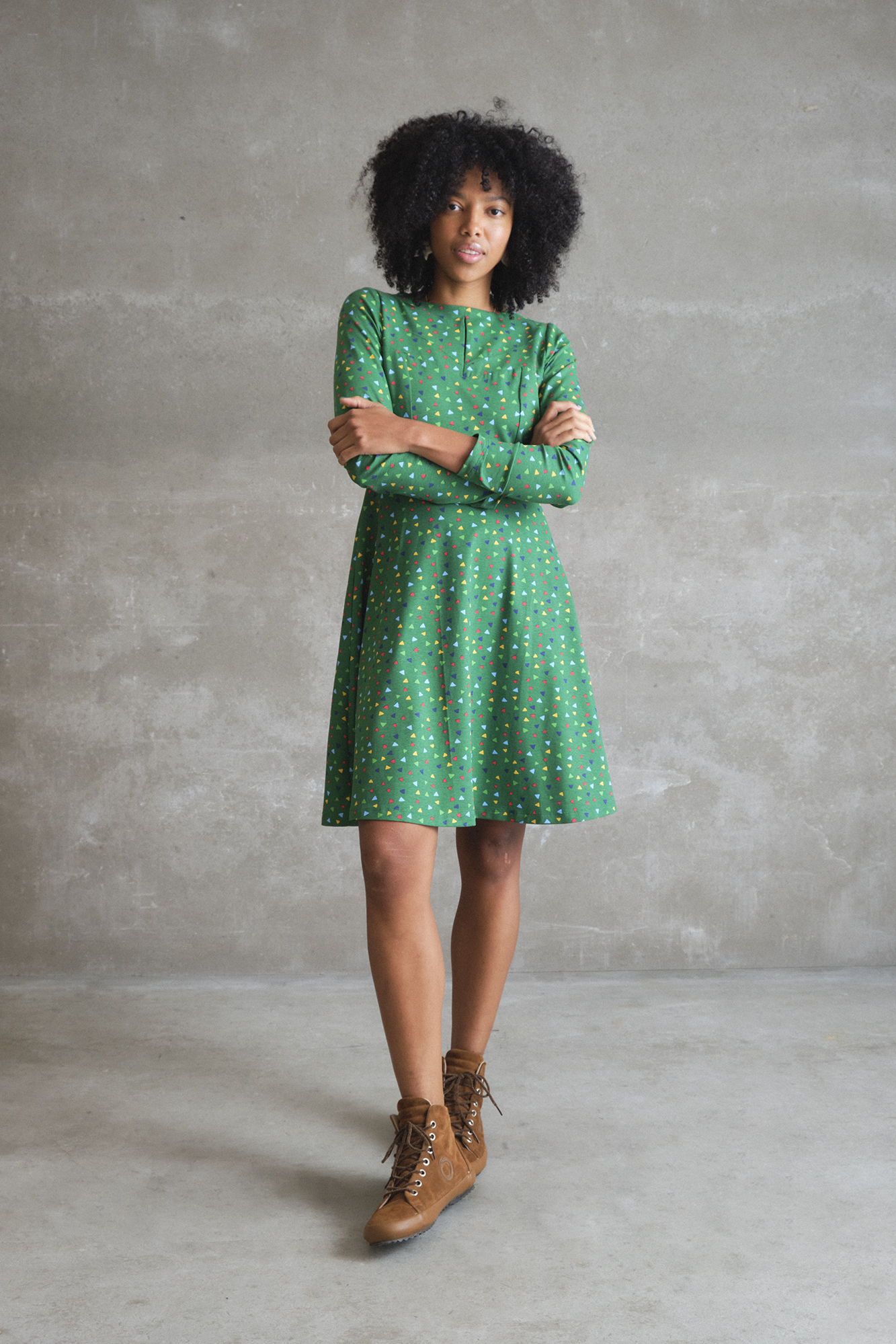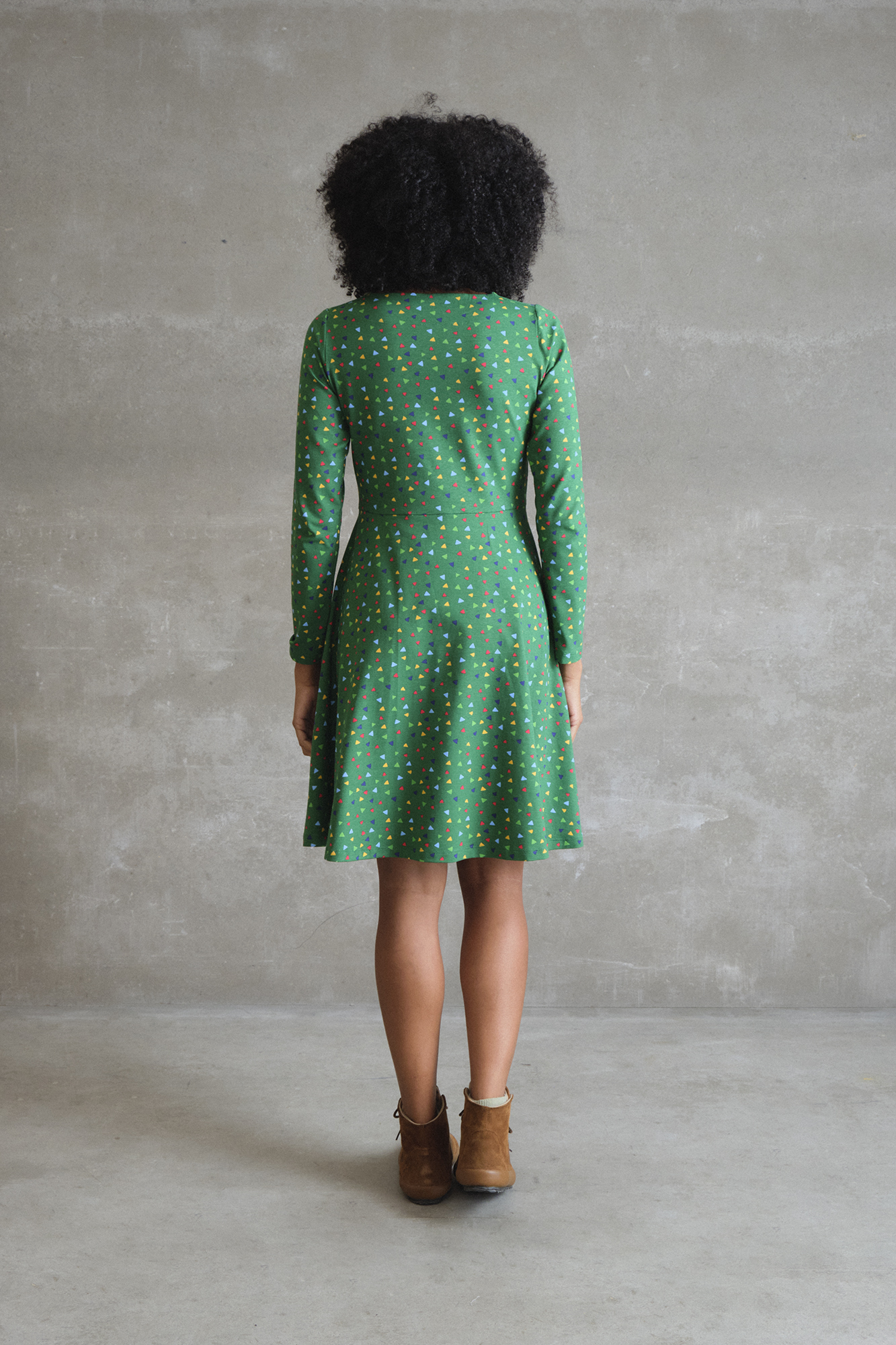Vestido de algodón de color verde con estampado de triángulos multicolores.