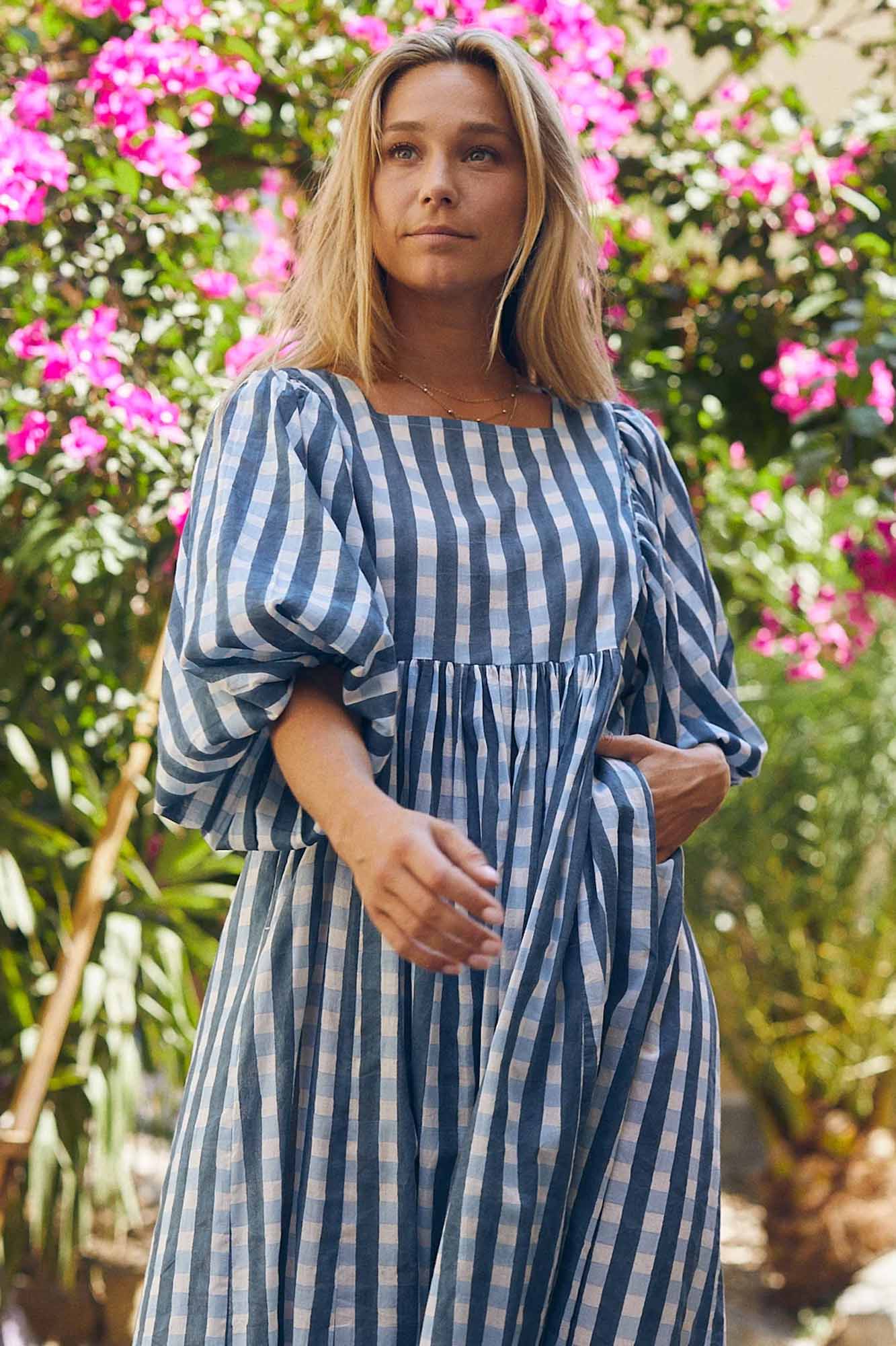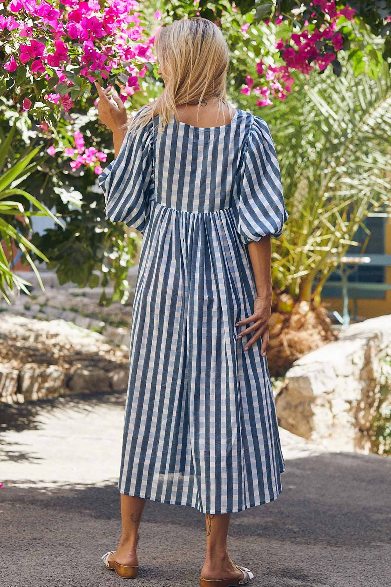 Precioso vestido de cuadros vichy en tonos azules y blanco.