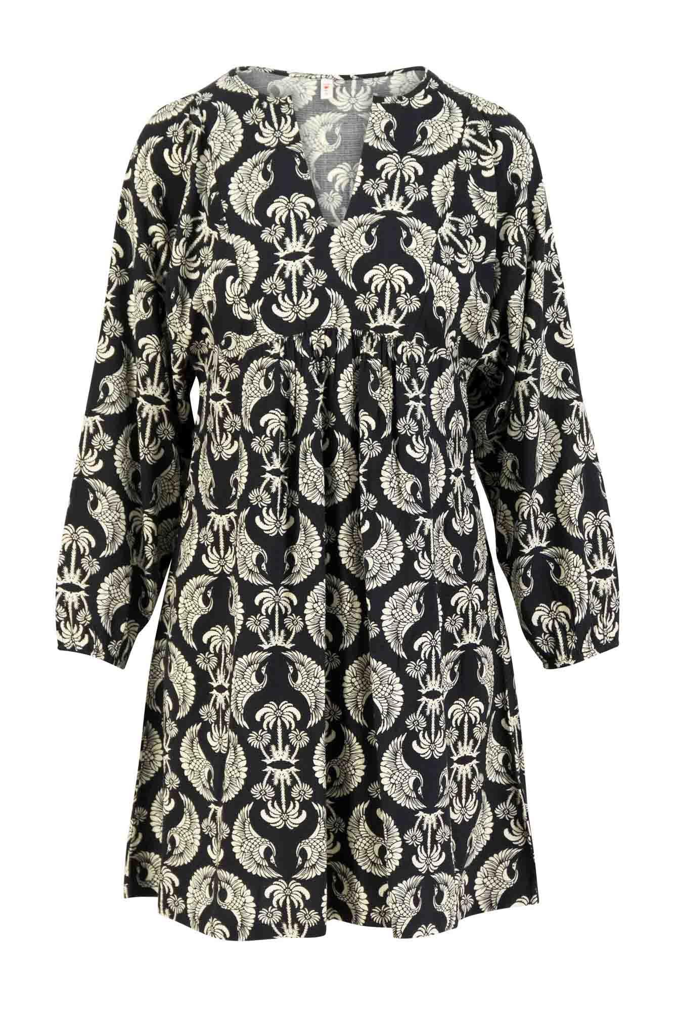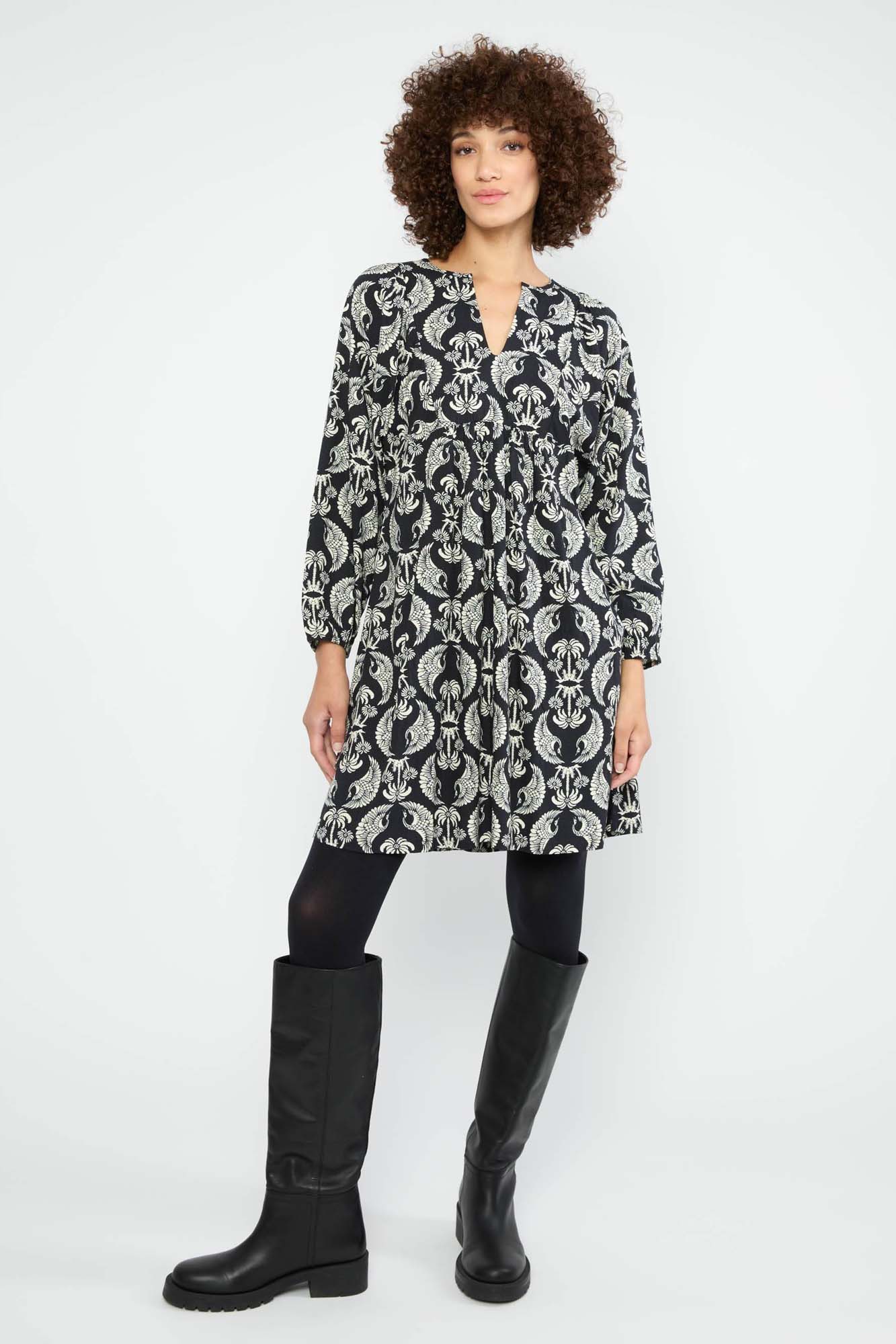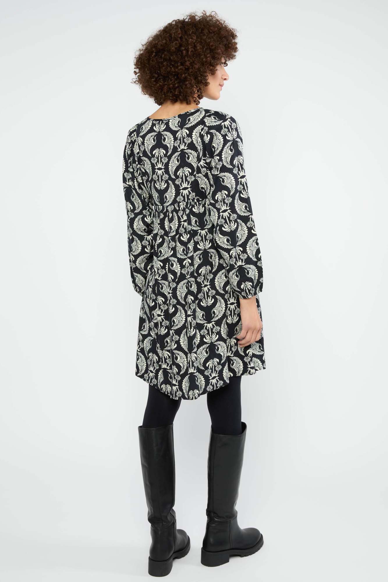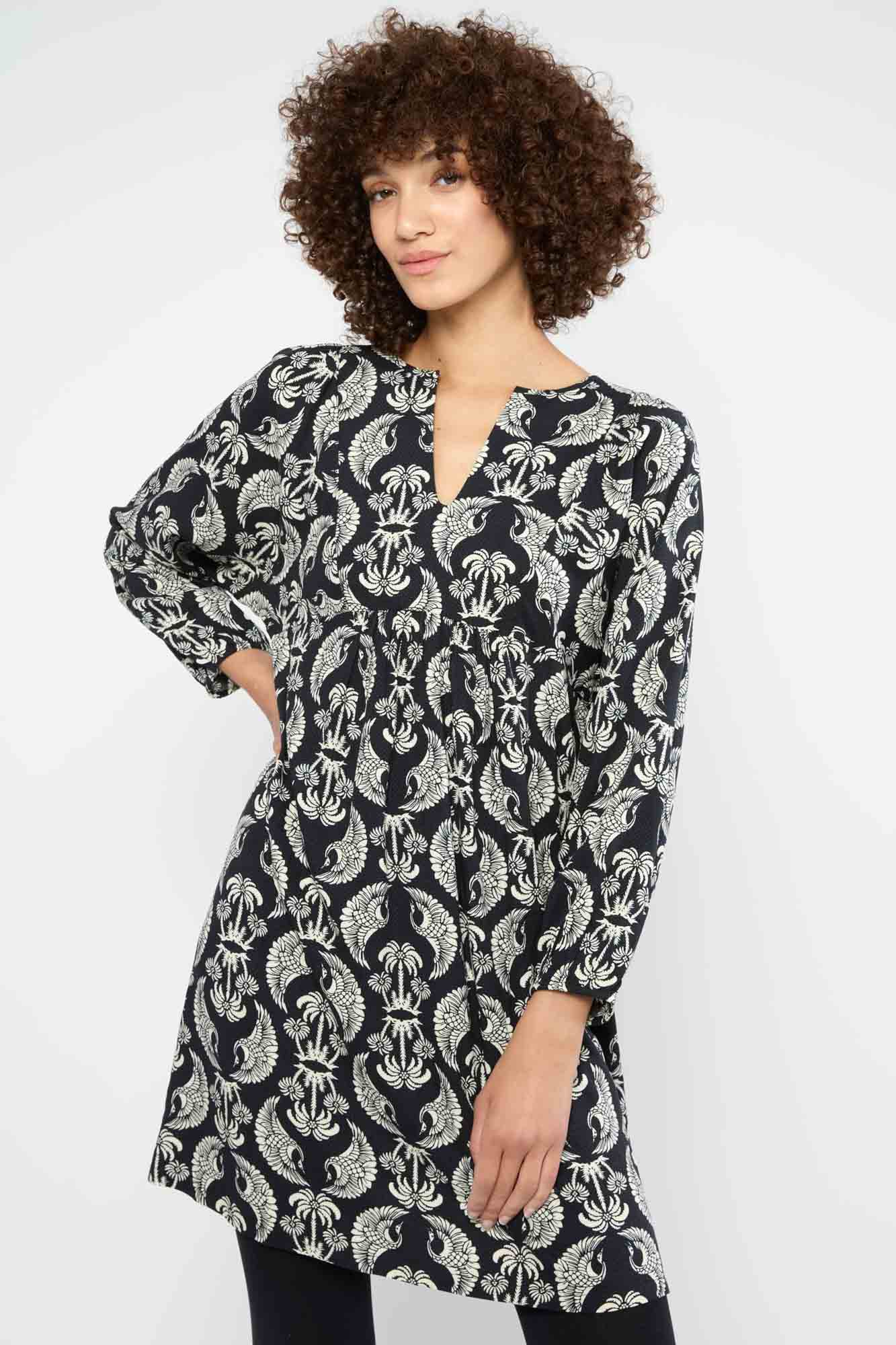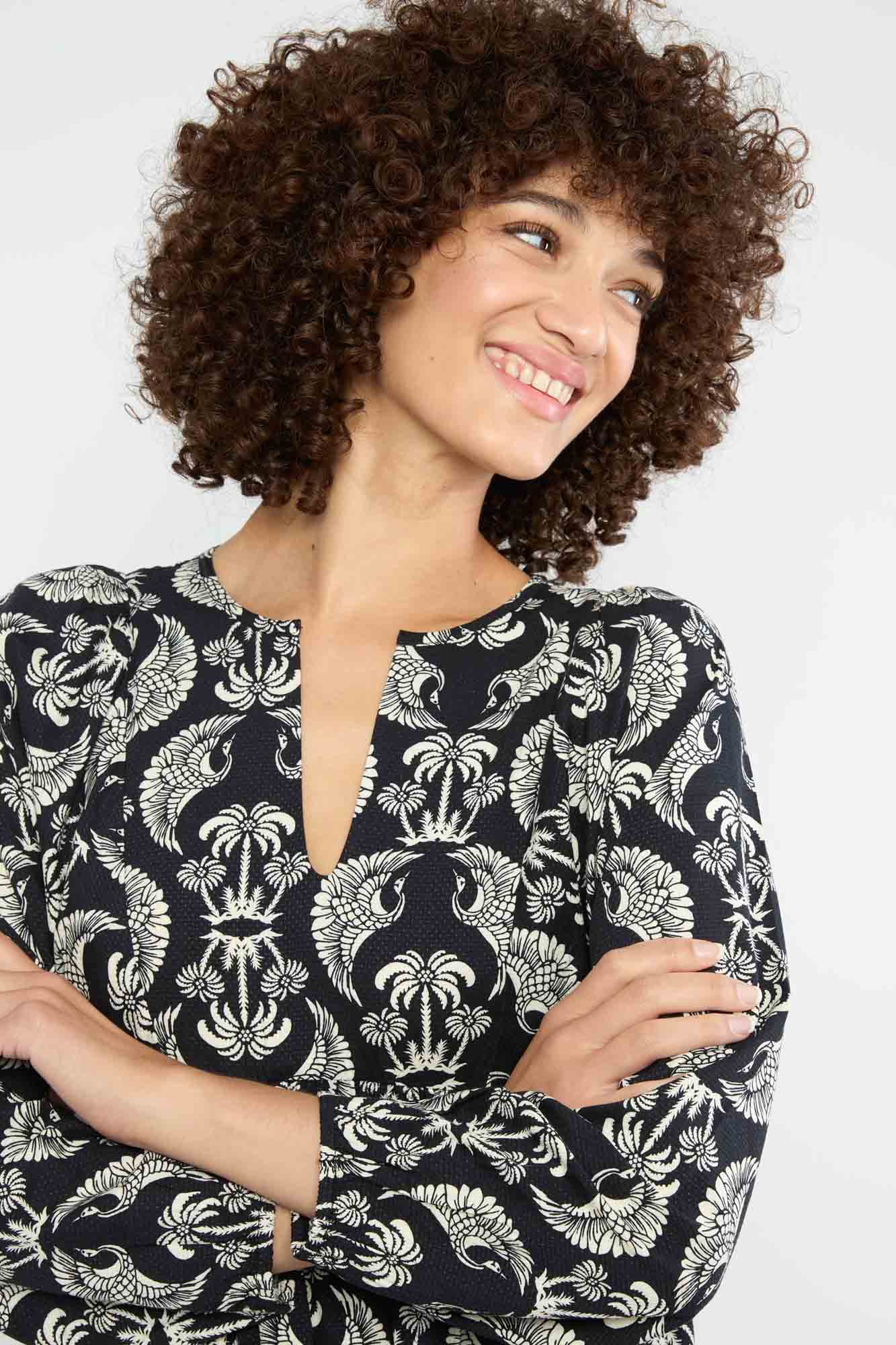 Con cuello redondeado y escote en forma de pico, poco pronunciado.
