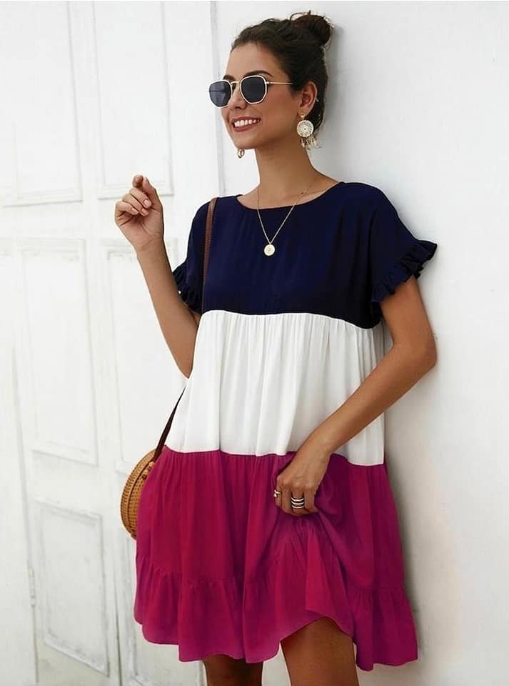 Bonito vestido casual para mujer tricolor de manga corta con volante para primavera🌺  verano☀️